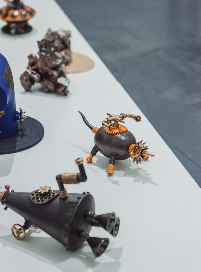 The Immortal of Play exhibition, featuring Amy Chang and Wei Cheng, at gallery Canton-Sardine – in the heart of China Town, Vancouver, opened Sept. 27. This is not the first time that Amy (Li- chuan) Chang and Wei Cheng have collaborated on an exhibition. In December 2018, Wei presented a performance at the Chinese Cultural Centre, supported by the music of Selena Yu, and Amy created an installation of her ‘organic’ objects. It was a well-attended, adventurous and explorative exhibition, as is theImmortal of Play exhibit.The Canton-Sardine is a good-sized gallery with a high ceiling, in the basement of the Sun Wah building on the 200 block of E. Keefer. Steven Dragonn, who curated this exhibit, founded the gallery in July 2018. It is a Vancouver based artist-run centre, focussed on contemporary art, open to publishing, performances and residencies, as well as exhibitions.Once again both artists have pushed boundaries. Amy constructs enticing, precise, irreverent assemblages that suggest inert machinery growing out of organic forms. Quoting from Dragonn’s gallery statement – “Amy Chang’s work takes inspiration from Steampunk, a genre of the 1980s/90s North American subculture … three levels of imitation find peculiar connections between the practical and the useless….”. The humour, inherent in the work, is offset by the rigour of Chang’s manufacture and her attention to detail.