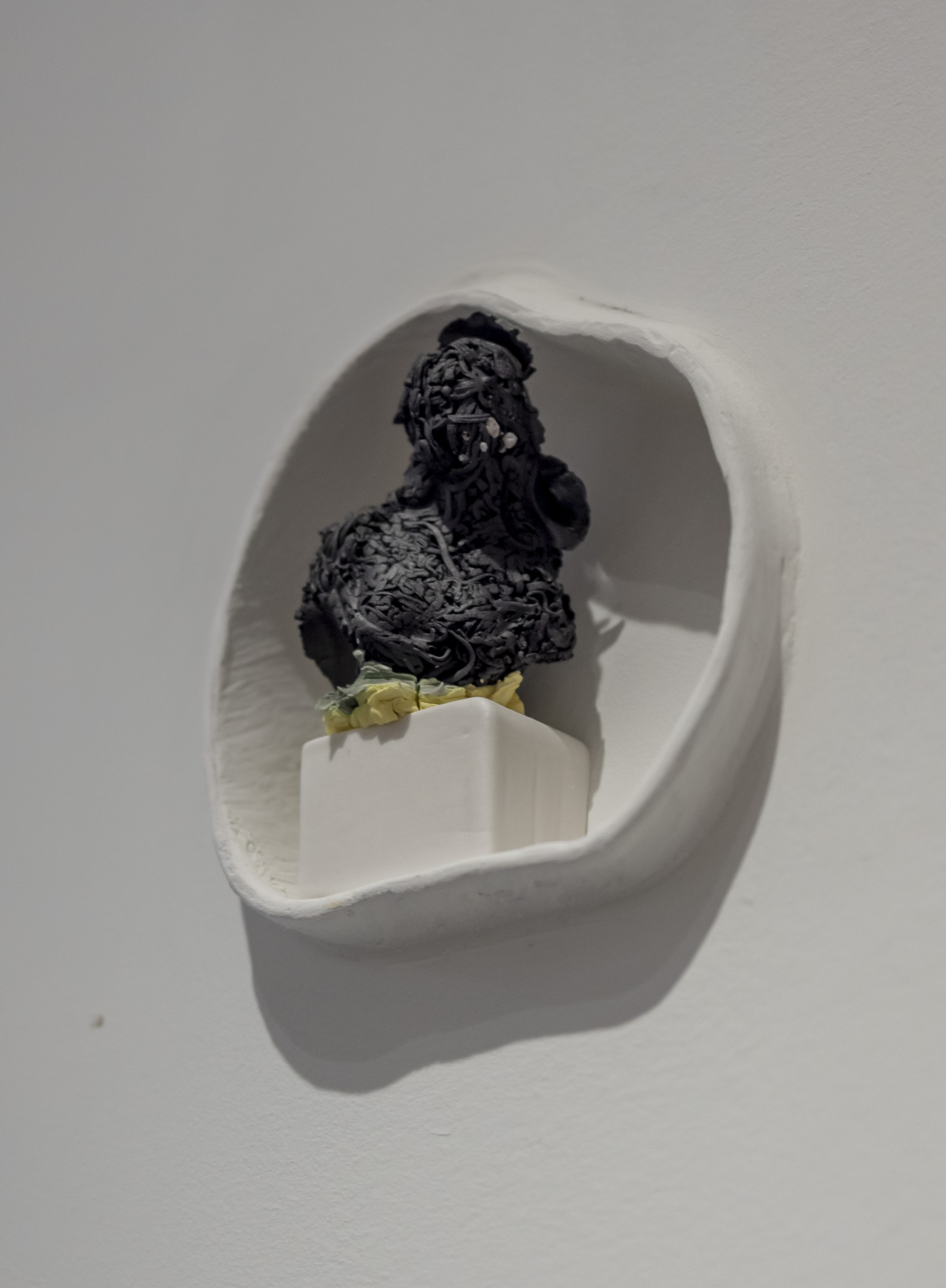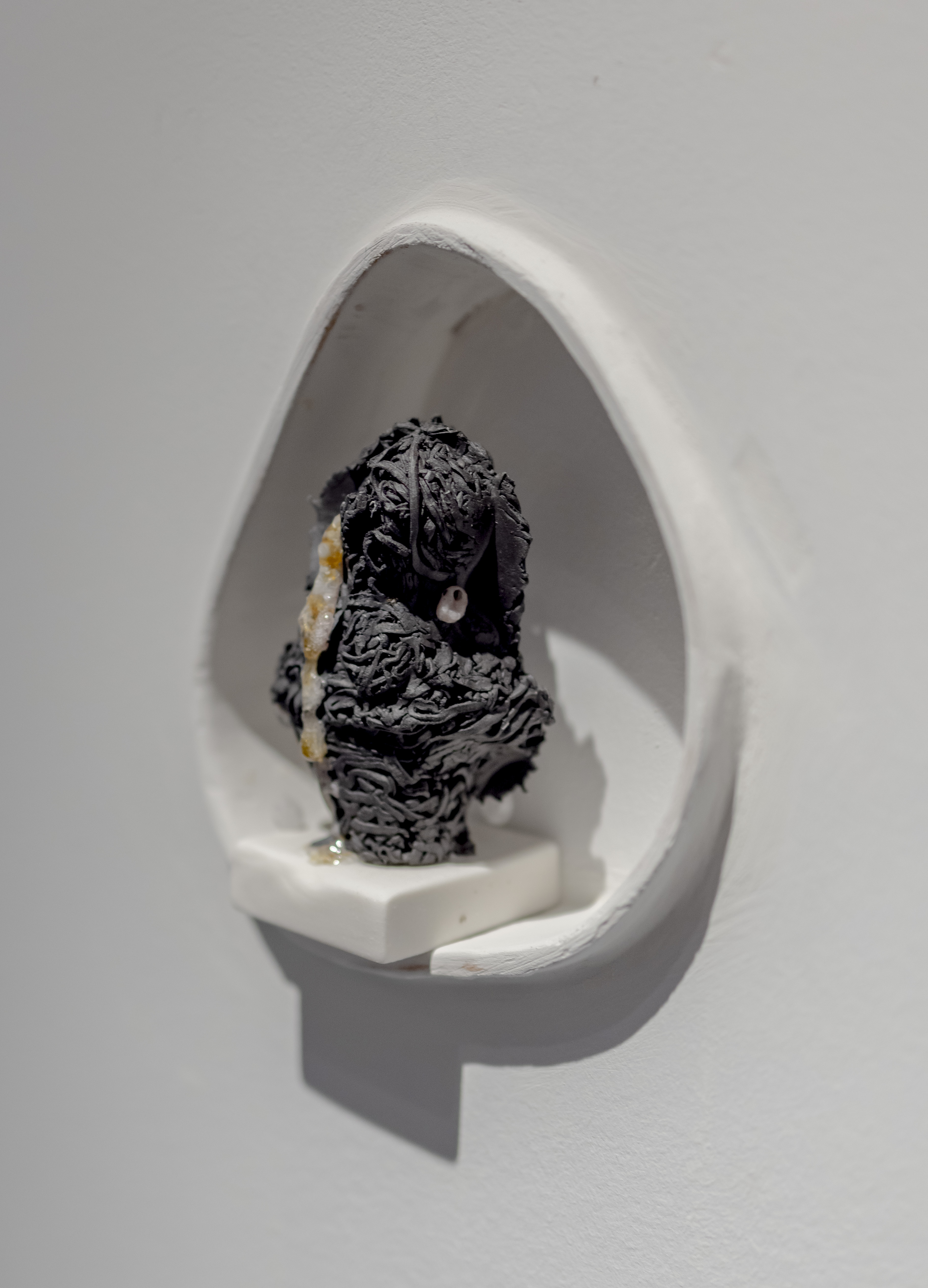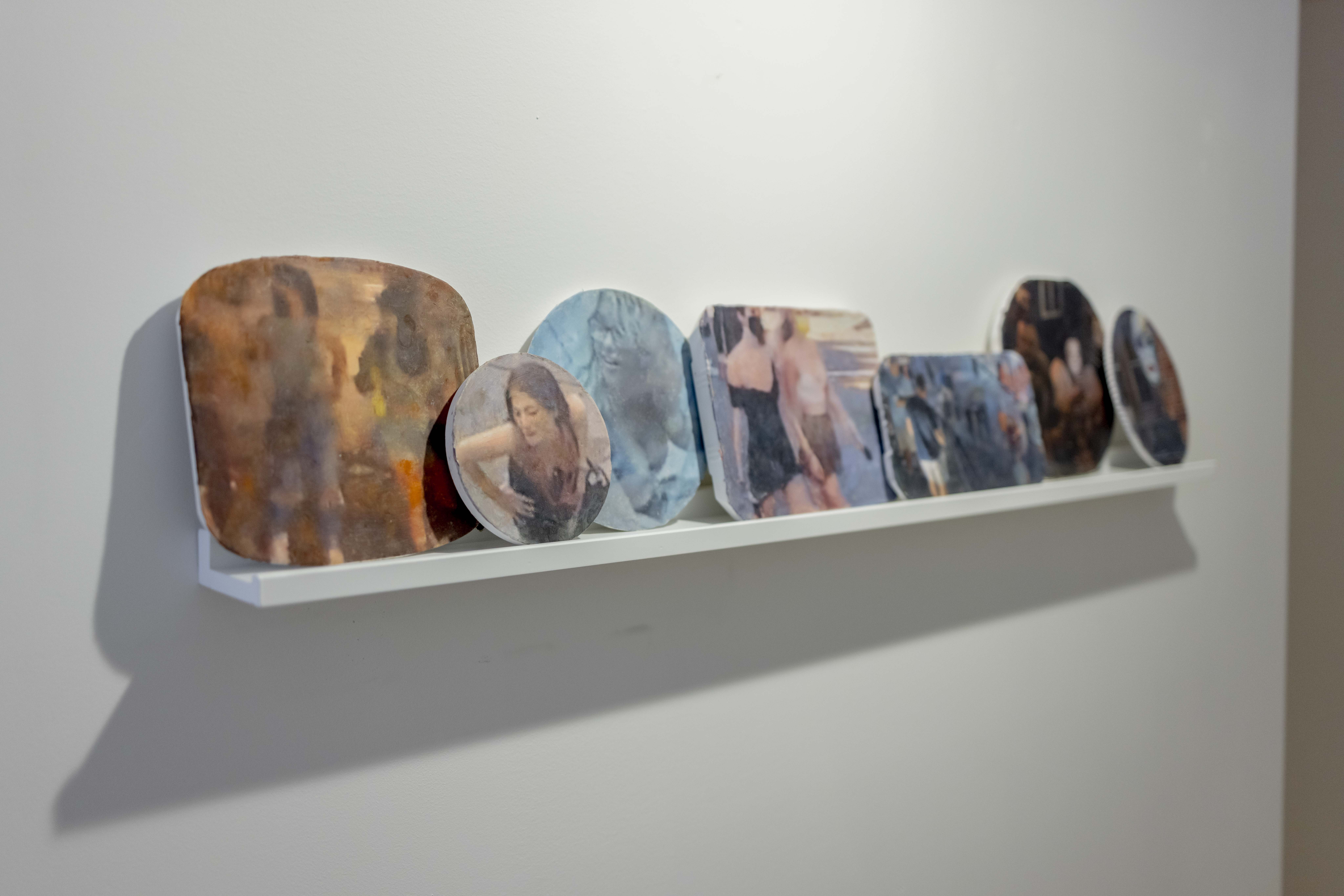 Praying for Time / Ella Mievovsky / ink and oil painting on plaster, painted wood shelf / 120x6x22cm / 2022