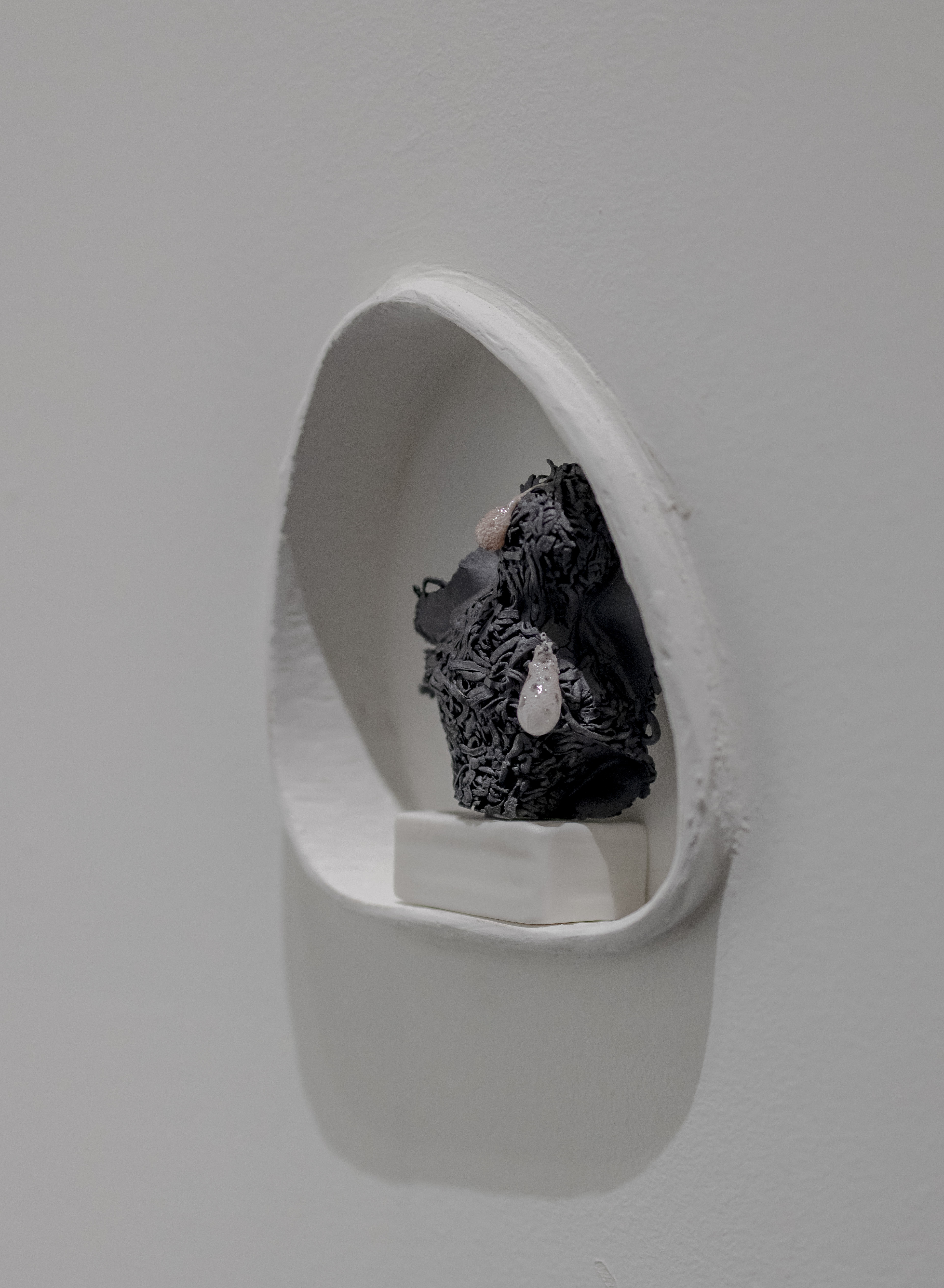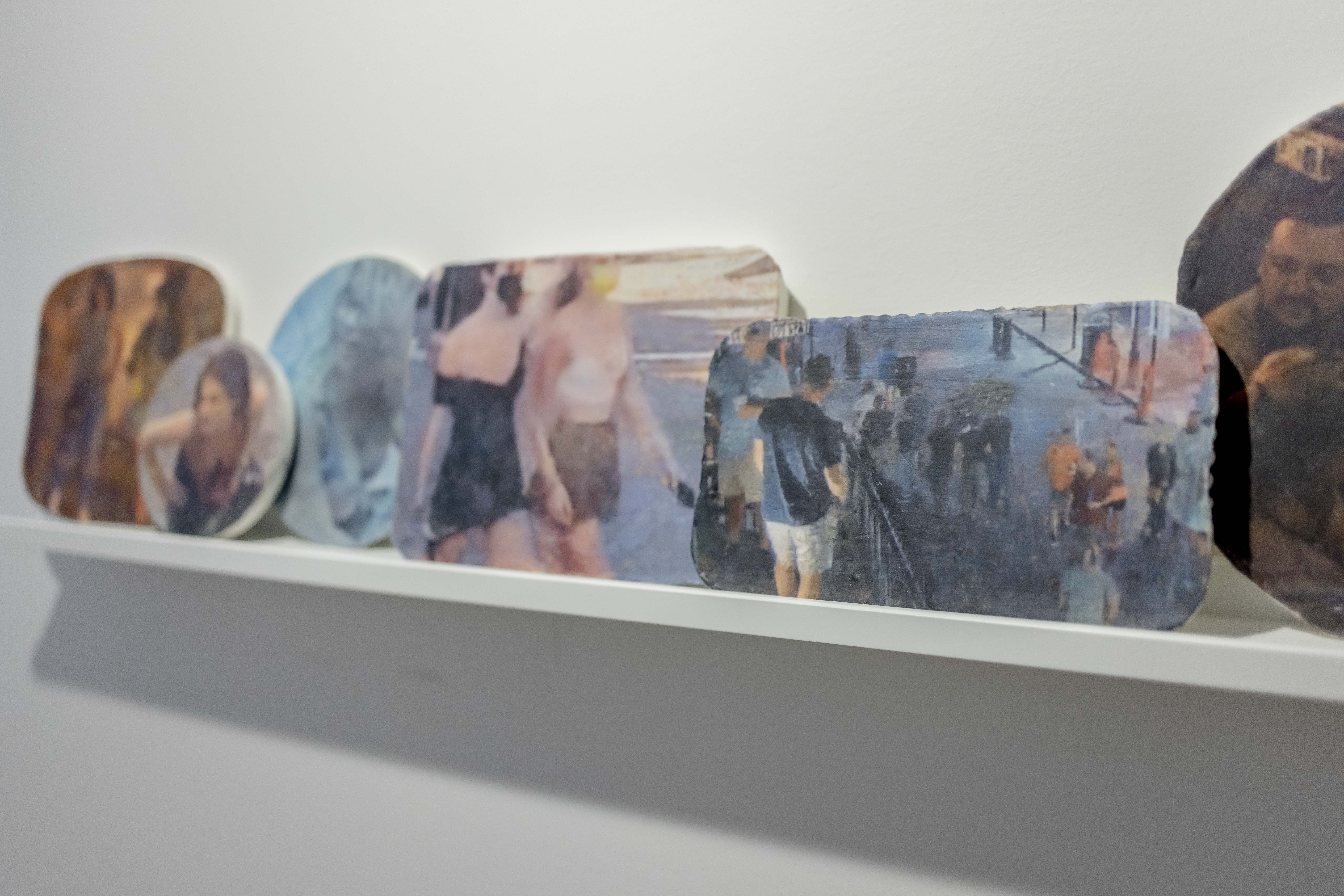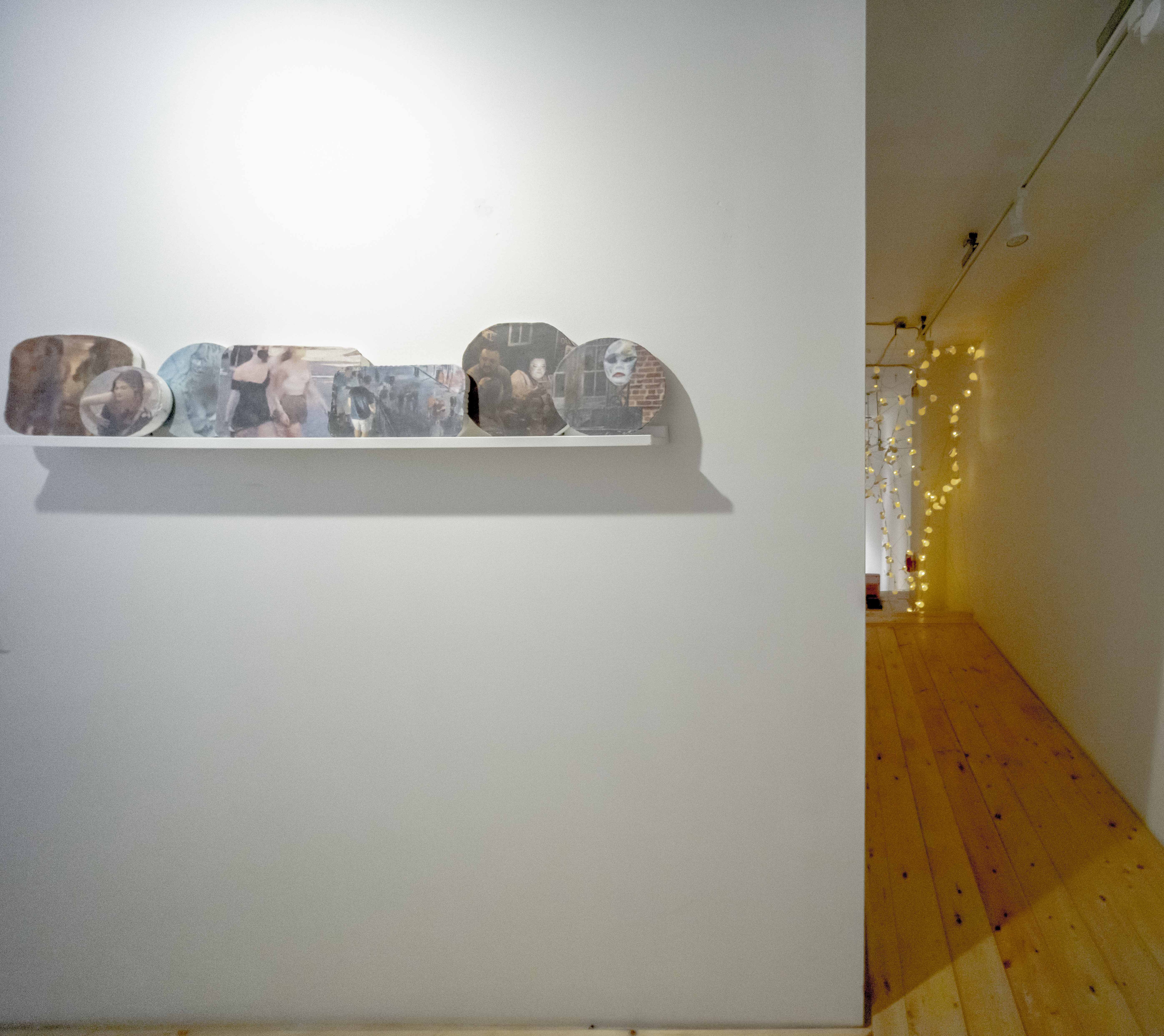 Praying for Time / Ella Mievovsky / ink and oil painting on plaster, painted wood shelf / 120x6x22cm / 2022