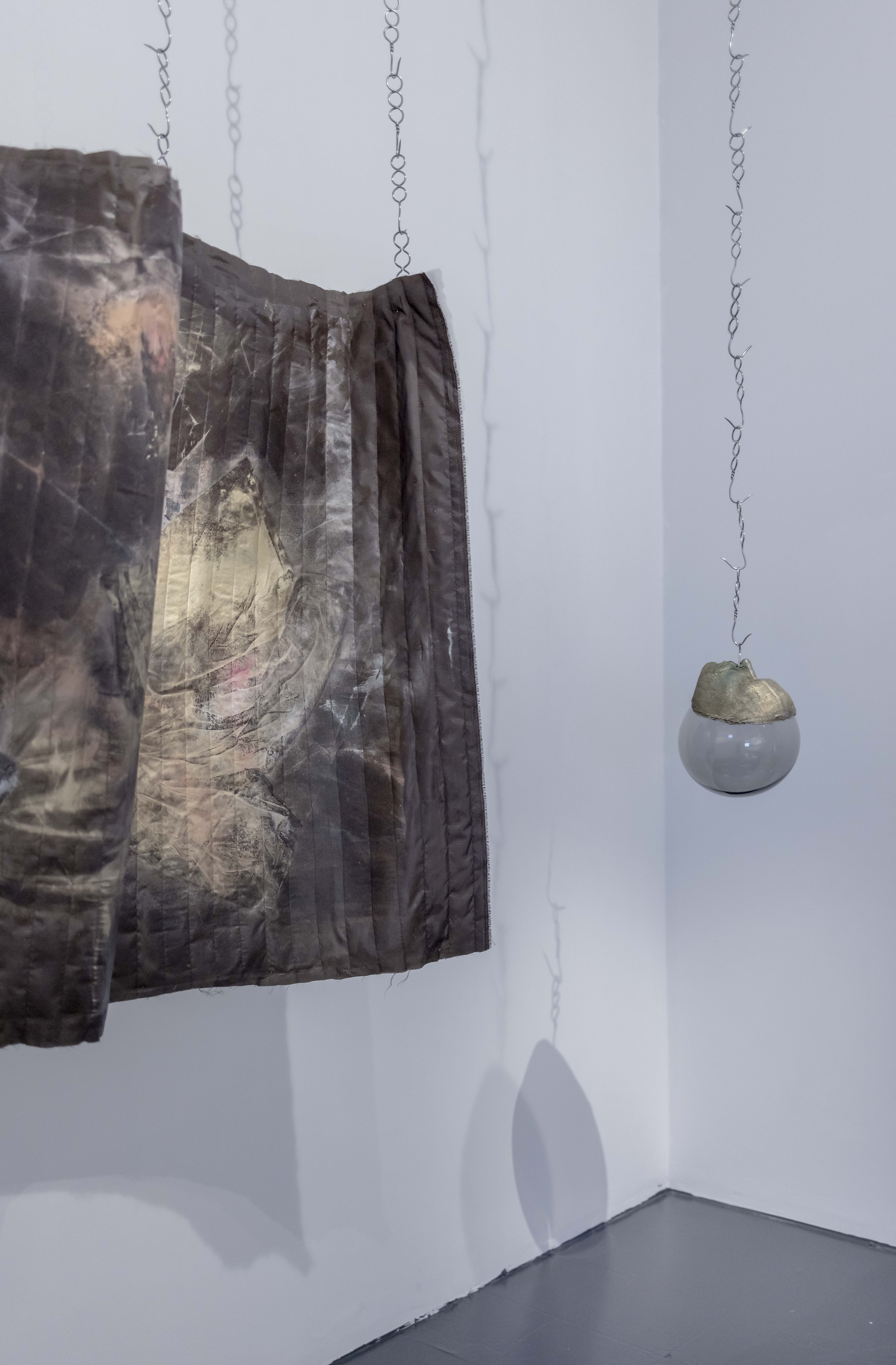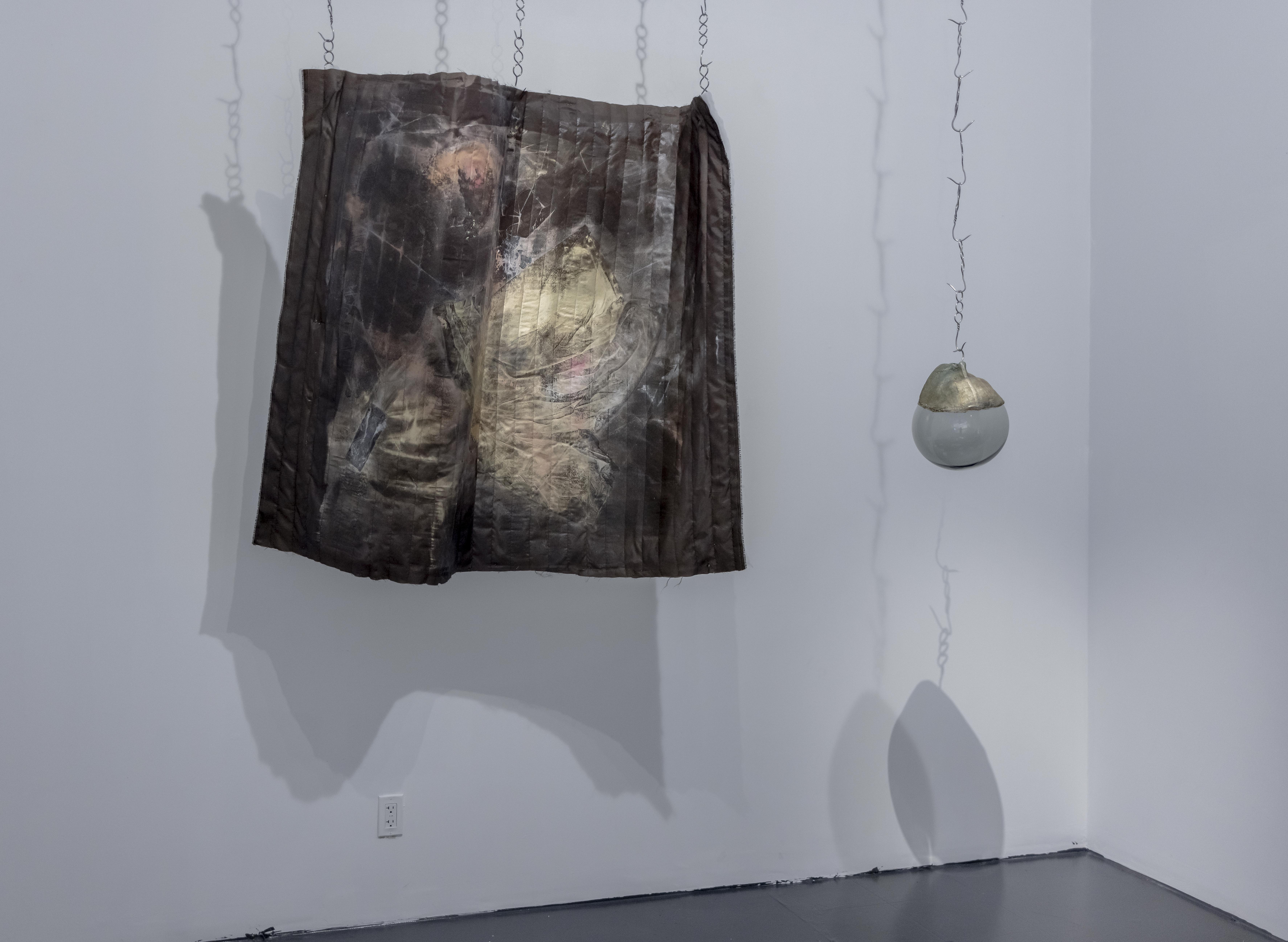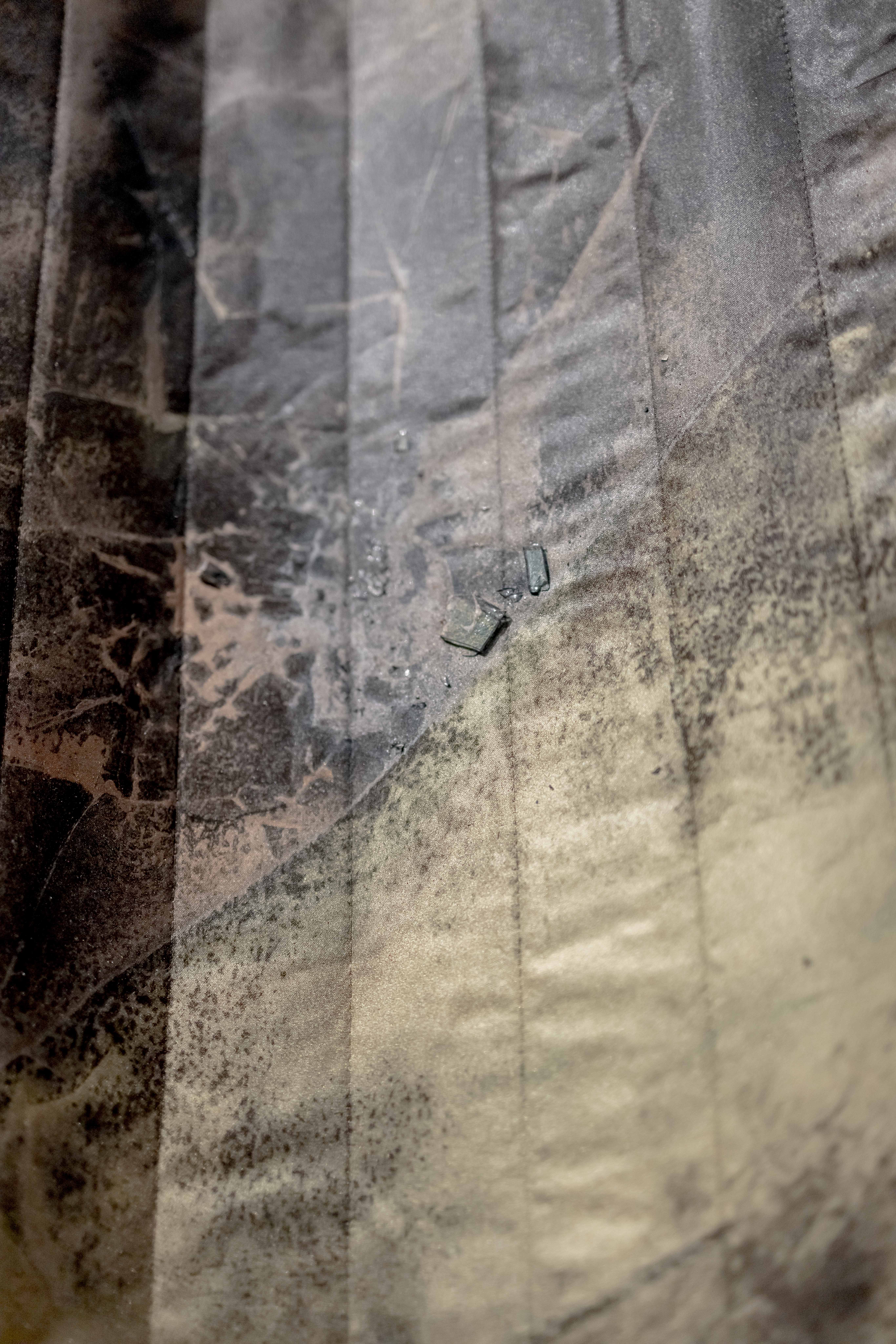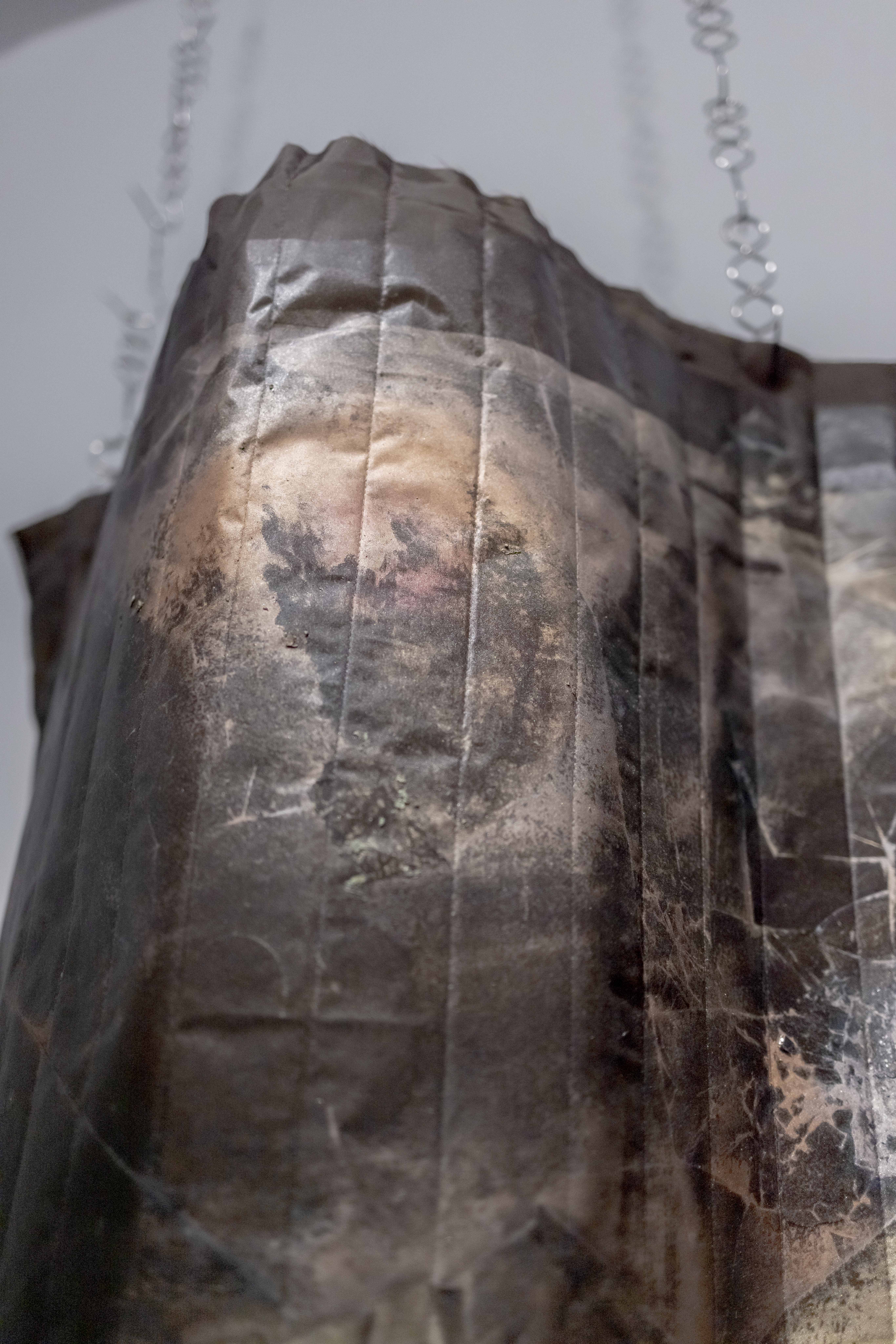 Chocolate / Fabien Villon / Copper, gold, silver and pigment powders on blanket, glue, varnish, stainless steel hooks / / 180x130x7cm / 2021