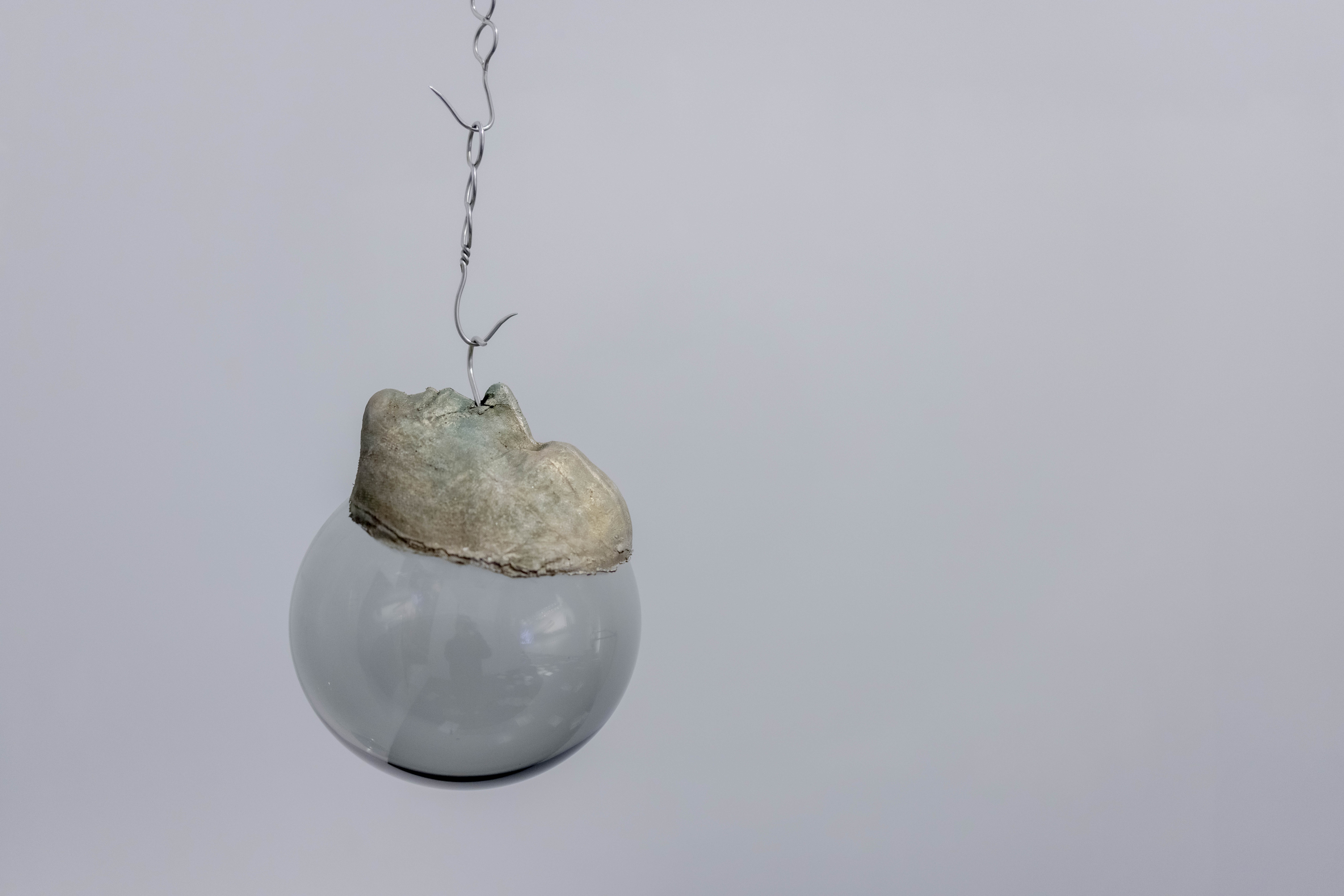 Fruit / Fabien Villon / Latex mask of the artist face with metal and pigments powders, glass sculpture made with Ferrari Testarossa gas emission, stainless steel hooks / 23x28x25cm / 2021