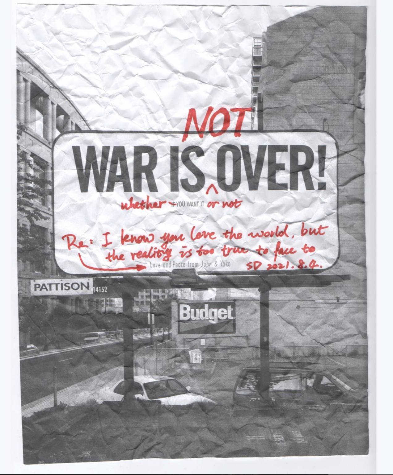 This conceptual piece is Dragonn’s response to Yoko Ono and John Lenon’s famous conceptual public art piece War is Over, which expresses the threat of war in our current time. Steven Dragonn 龍邃洋 is a visual artist based in Vancouver and Guangzhou China. Graduated from Guangzhou Academy of Fine Art in China with a BFA and from University of Paris East in France with a MA, he is director, curator and founder of Canton≠sardine. He is a beyond≠Conceptualist and Neo Hyper≠real Pictorialist across communicatics and personal visual experience. Specifically, he dedicated his work to examining political and social injustice, while his main curatorial interests include individual experience, migration of minorities, minor gender, personal identities, and social political sufferance.