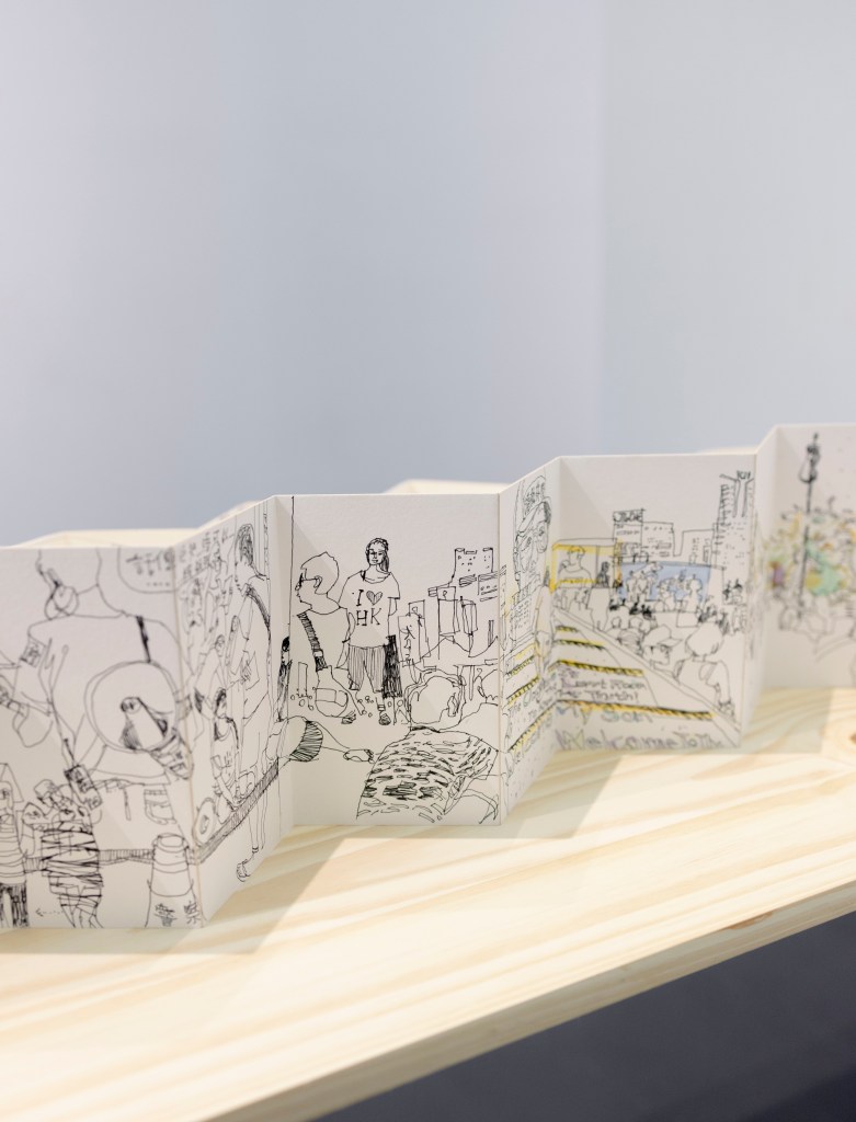 Harvey’s collection of on-location drawings was created amidst the protests against the implementation of national education and occupation in Mongkok and Central during the Umbrella Movement in Hong Kong in 2014. Utilizing an accordion format sketchbook, he aimed to capture the panoramic perspective of these events, imbuing them with a sense of scale and the passage of time. As both an onlooker, reporter, and participant, Harvey found this to be his natural expression as a visual artist amidst a social movement so deeply intertwined with his daily life.