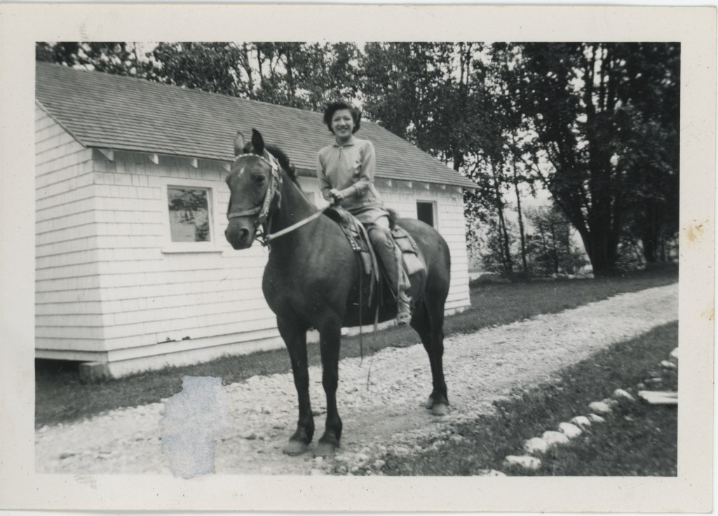 A nostalgic black and white photo of a young Faye Leung enjoying a ride on a horse.