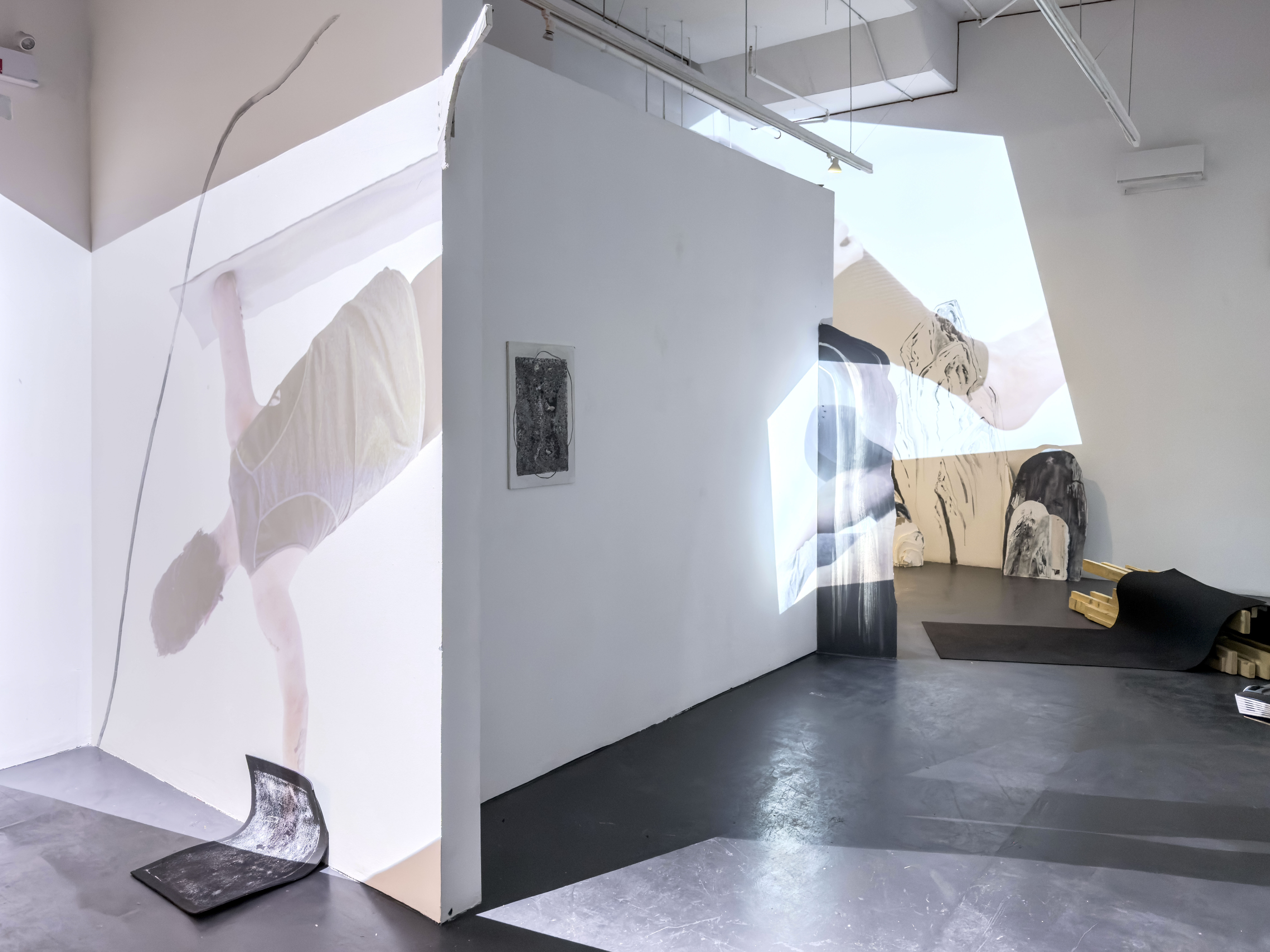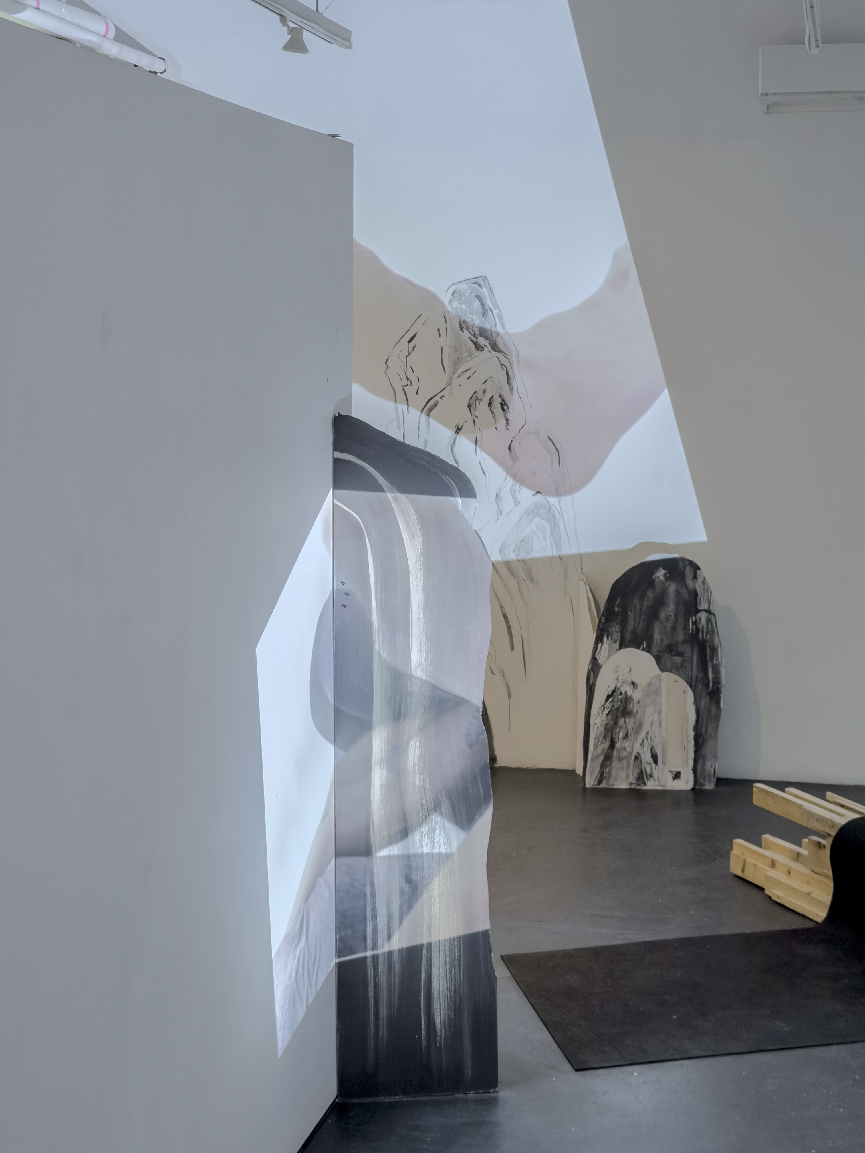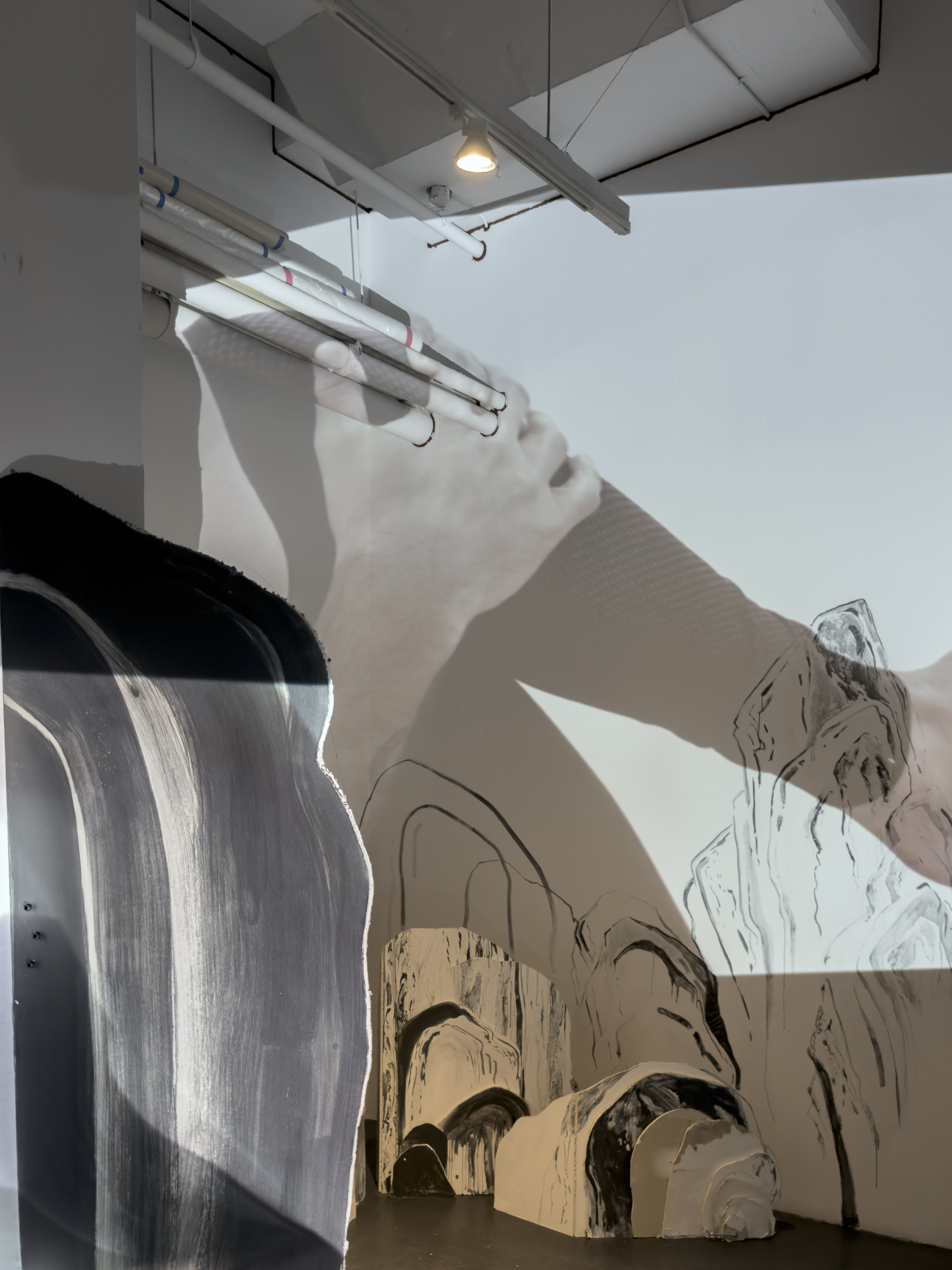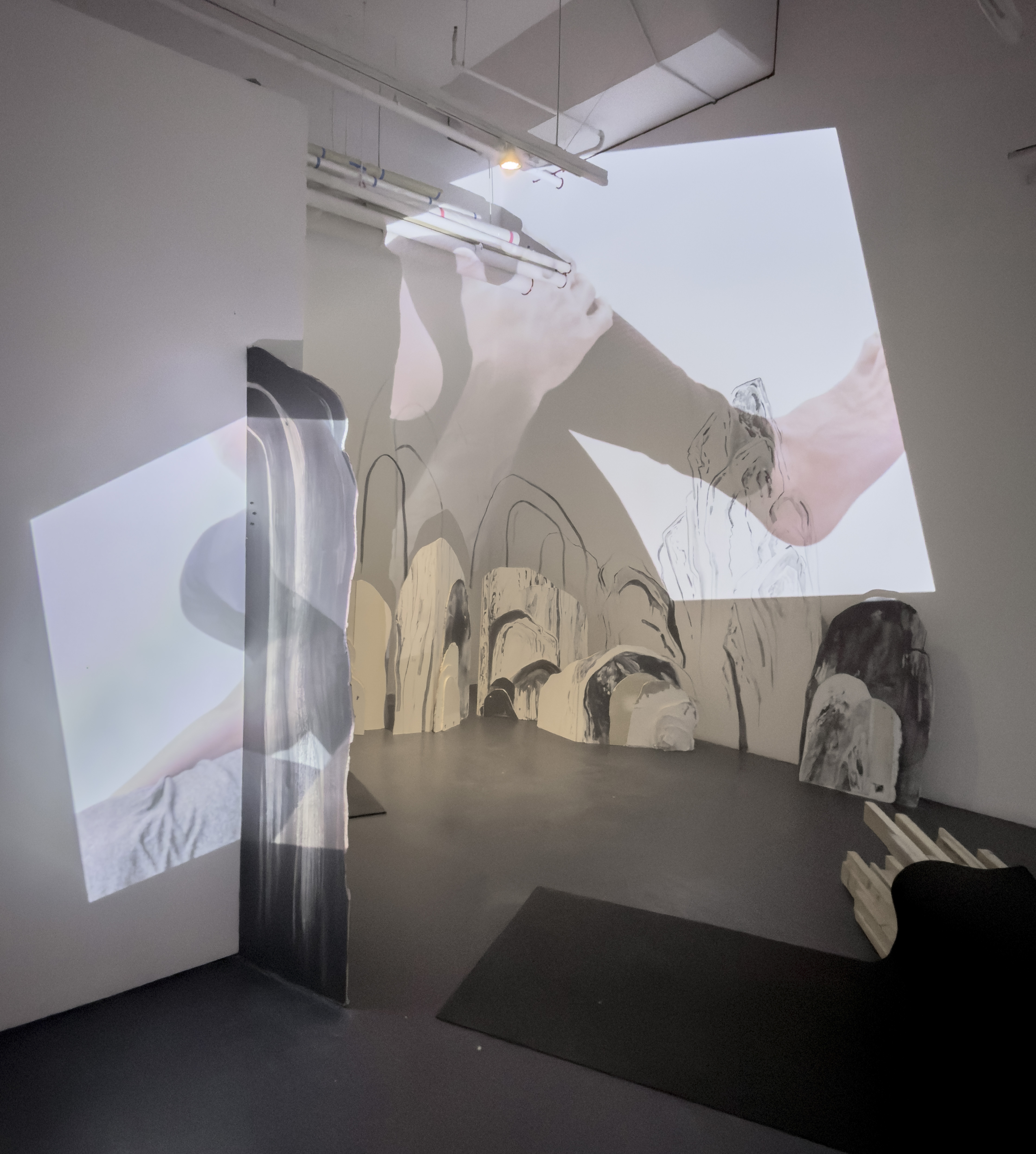 This exhibition explores the performance of the human body and its relationship to landscape. It takes the form of an immersive composition of fragmented bodily forms, presented through recordings of breathing and stretching exercises and gestural illustrations of caves and mountains, folding the body and landscape together. The repetitive labour, flexibility, and endurance involved in both bodily poses and material processes allude to practices of release and self-regulation, as an embodied metaphor for social and institutional participation in everyday life.