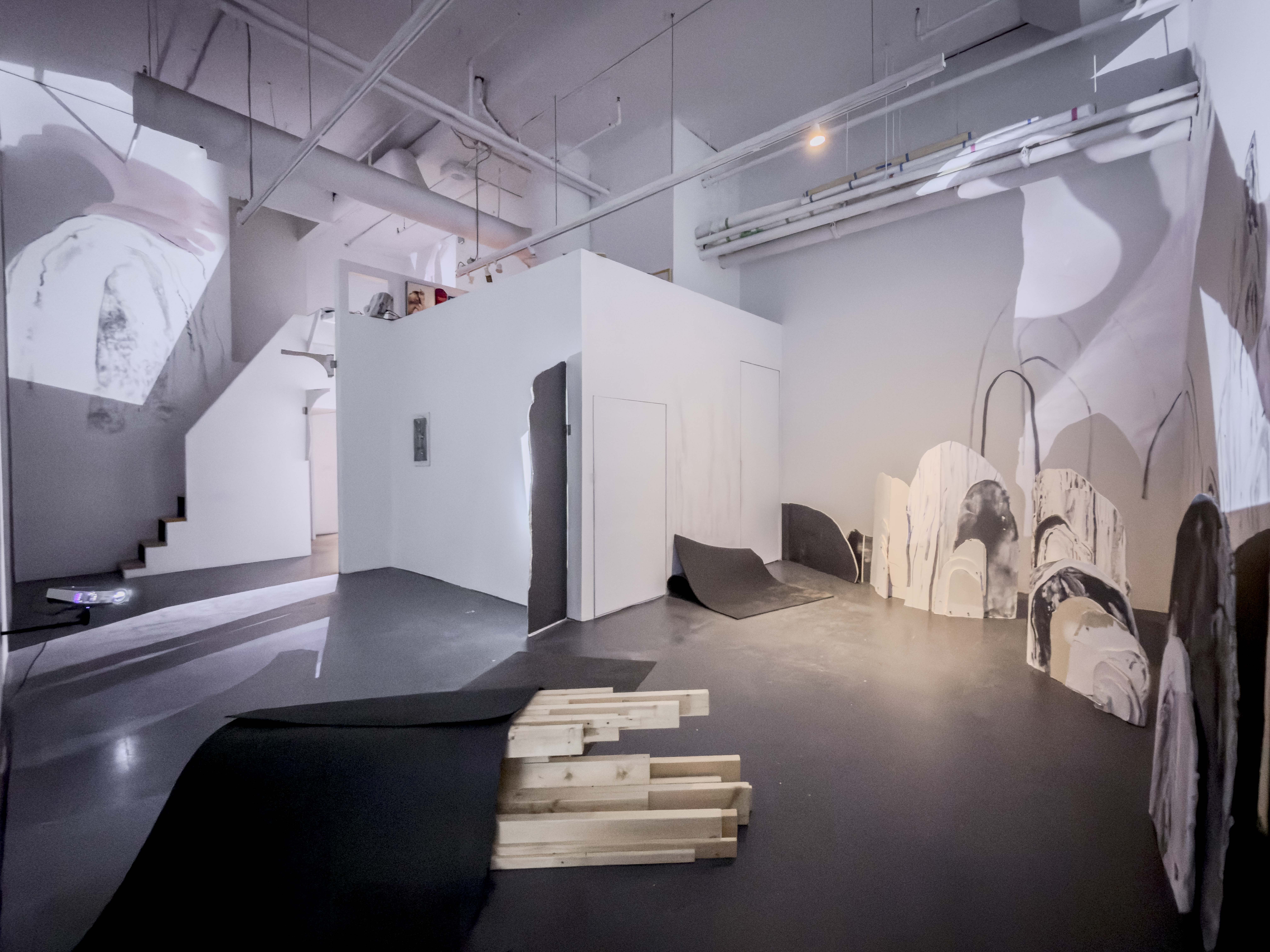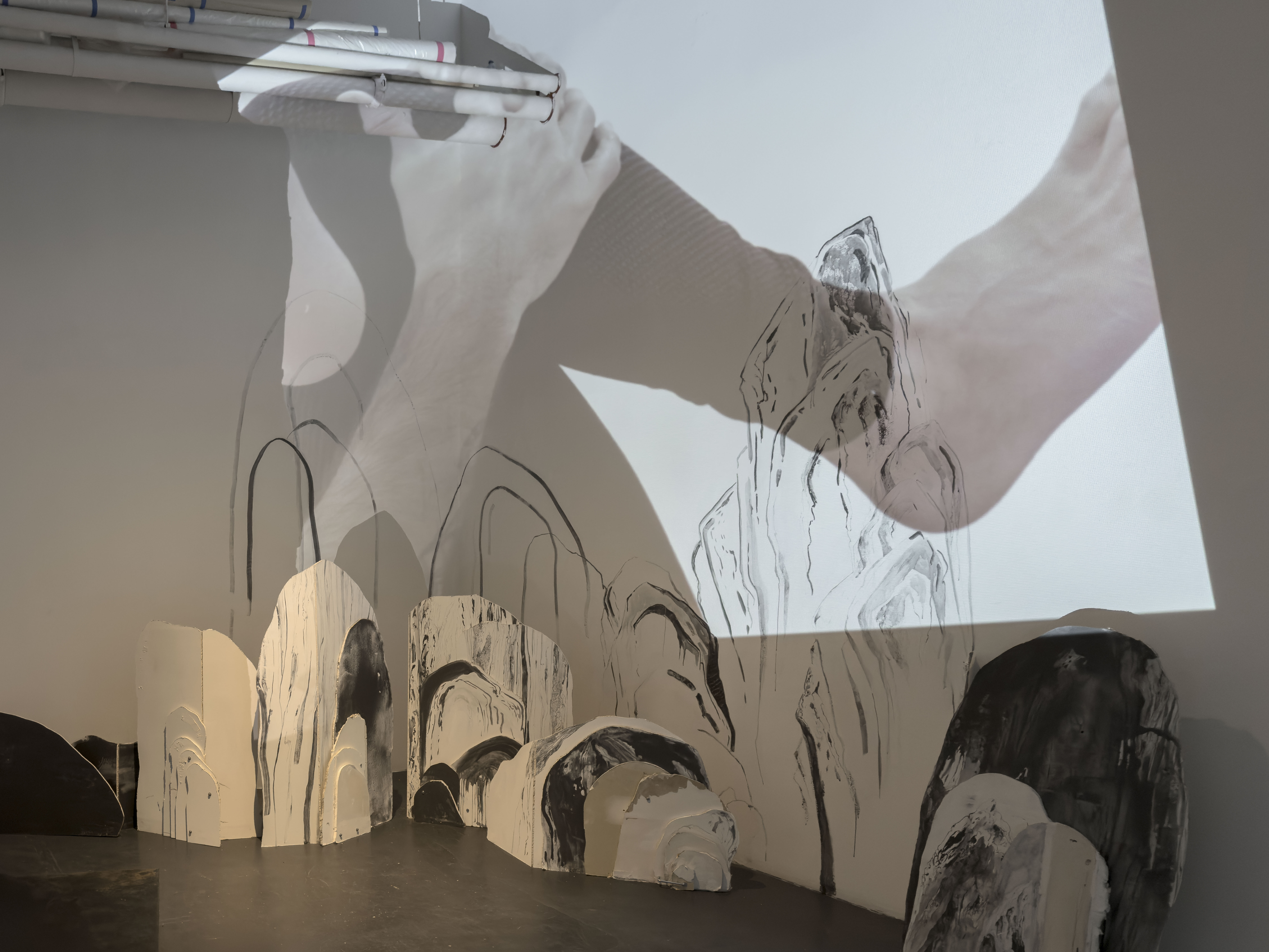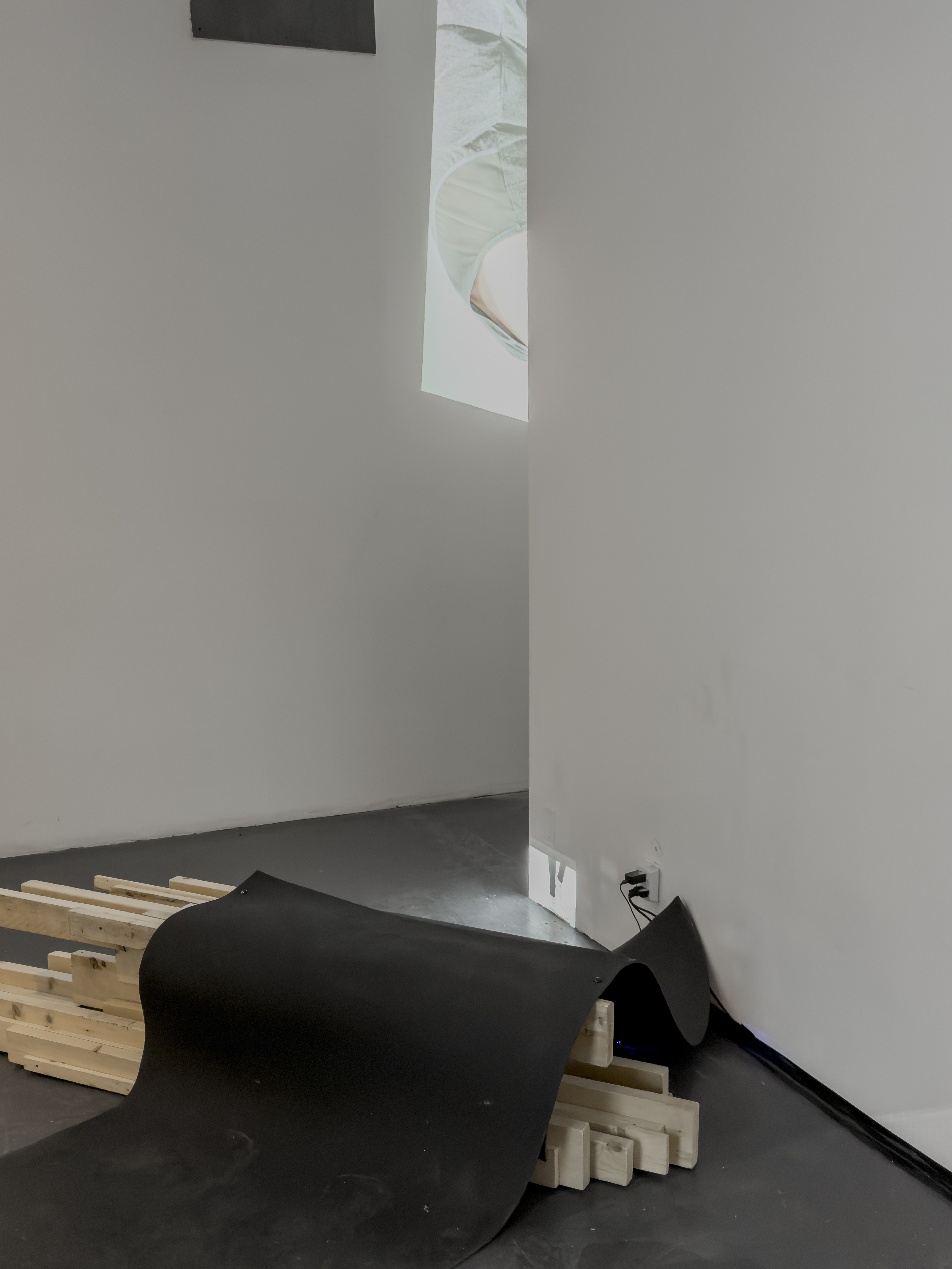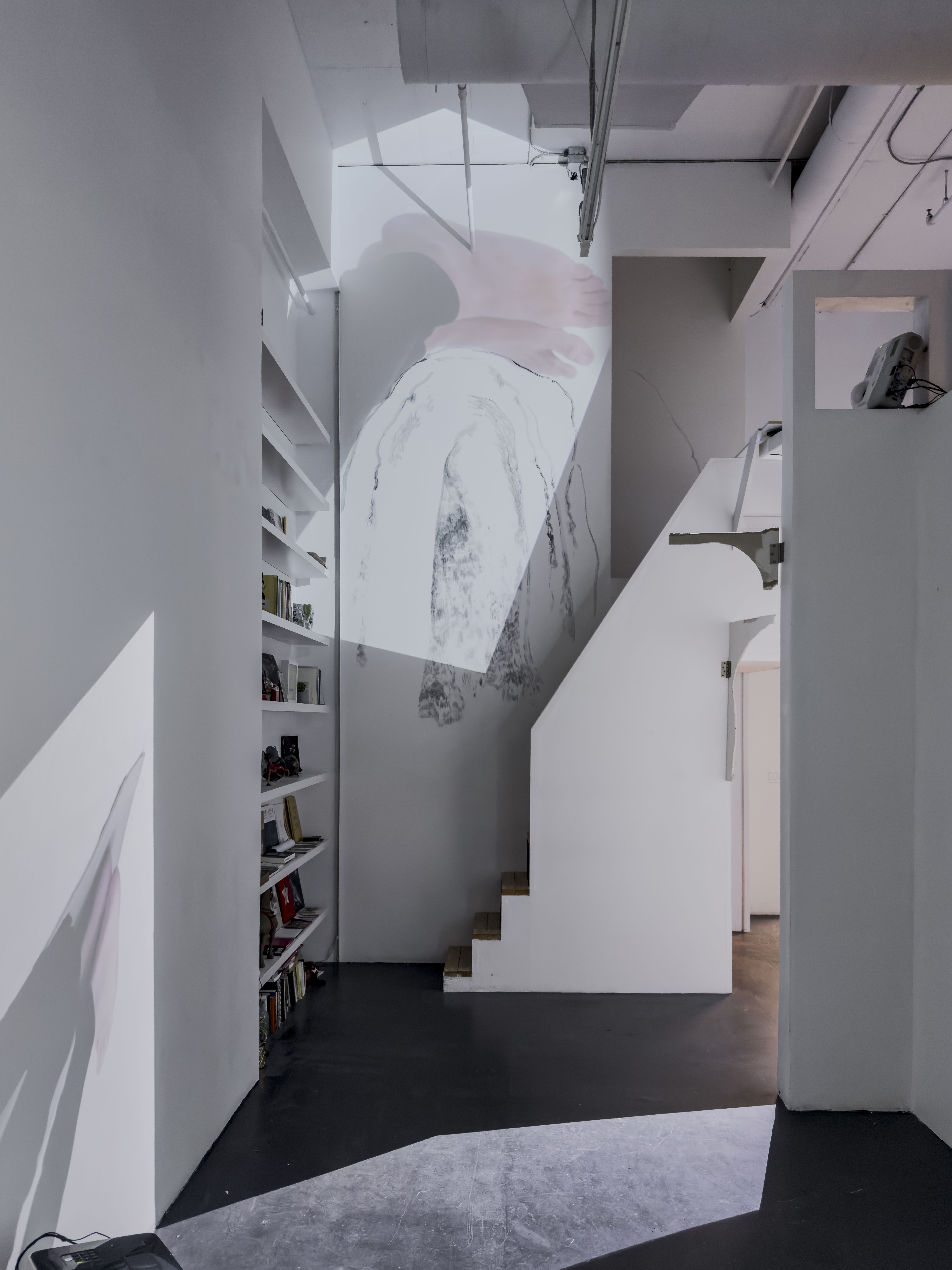 This exhibition explores the performance of the human body and its relationship to landscape. It takes the form of an immersive composition of fragmented bodily forms, presented through recordings of breathing and stretching exercises and gestural illustrations of caves and mountains, folding the body and landscape together. The repetitive labour, flexibility, and endurance involved in both bodily poses and material processes allude to practices of release and self-regulation, as an embodied metaphor for social and institutional participation in everyday life.