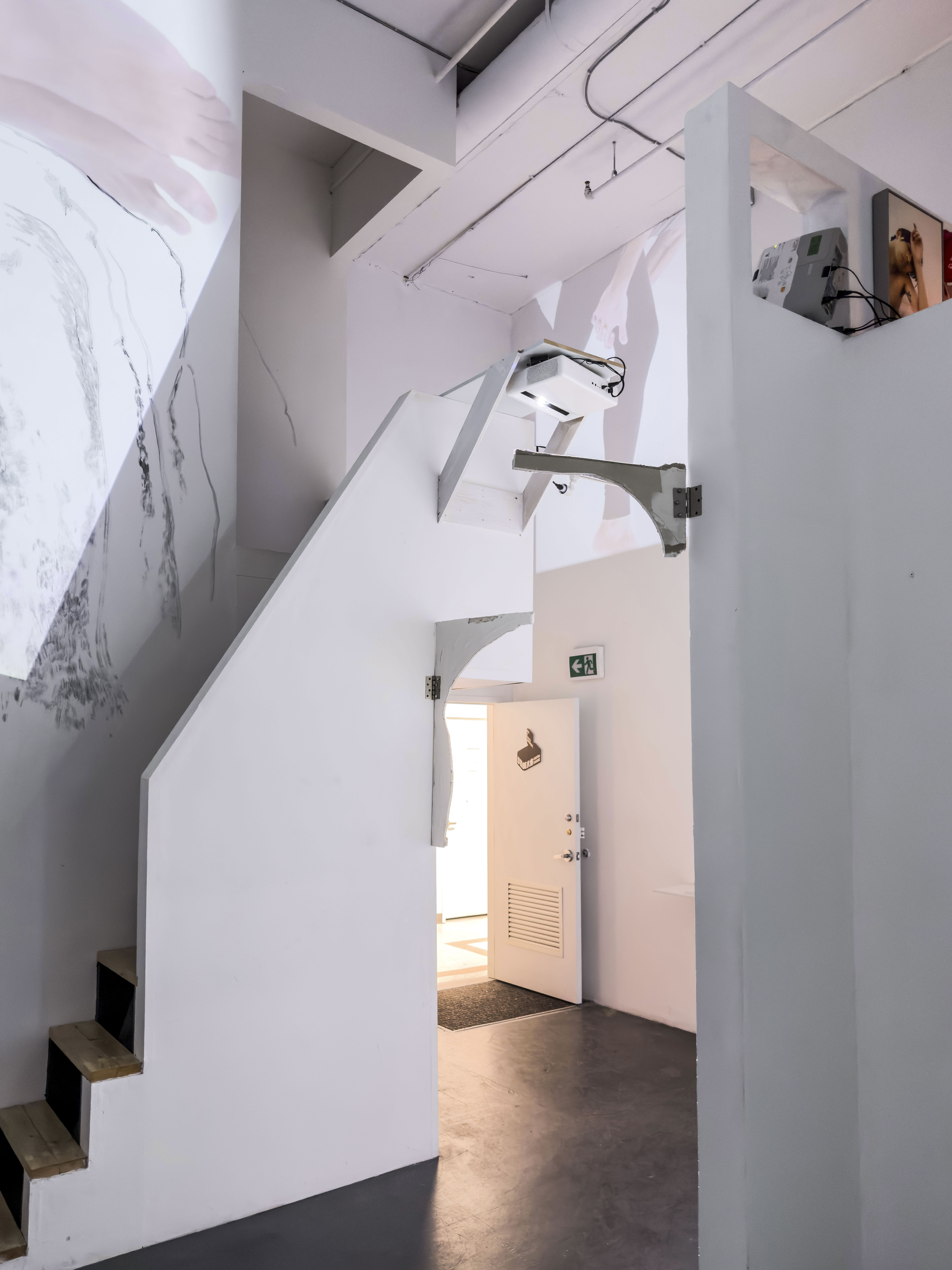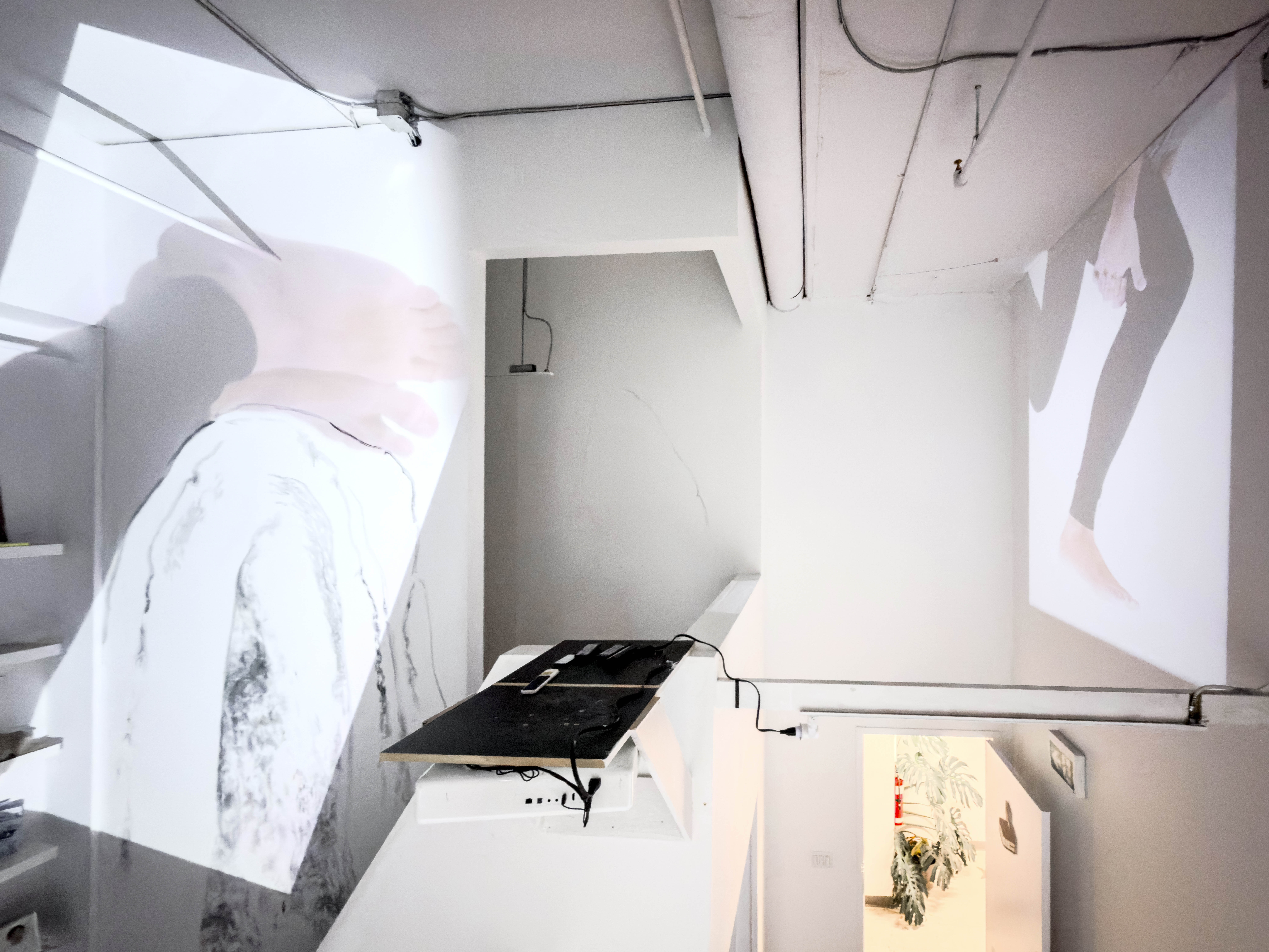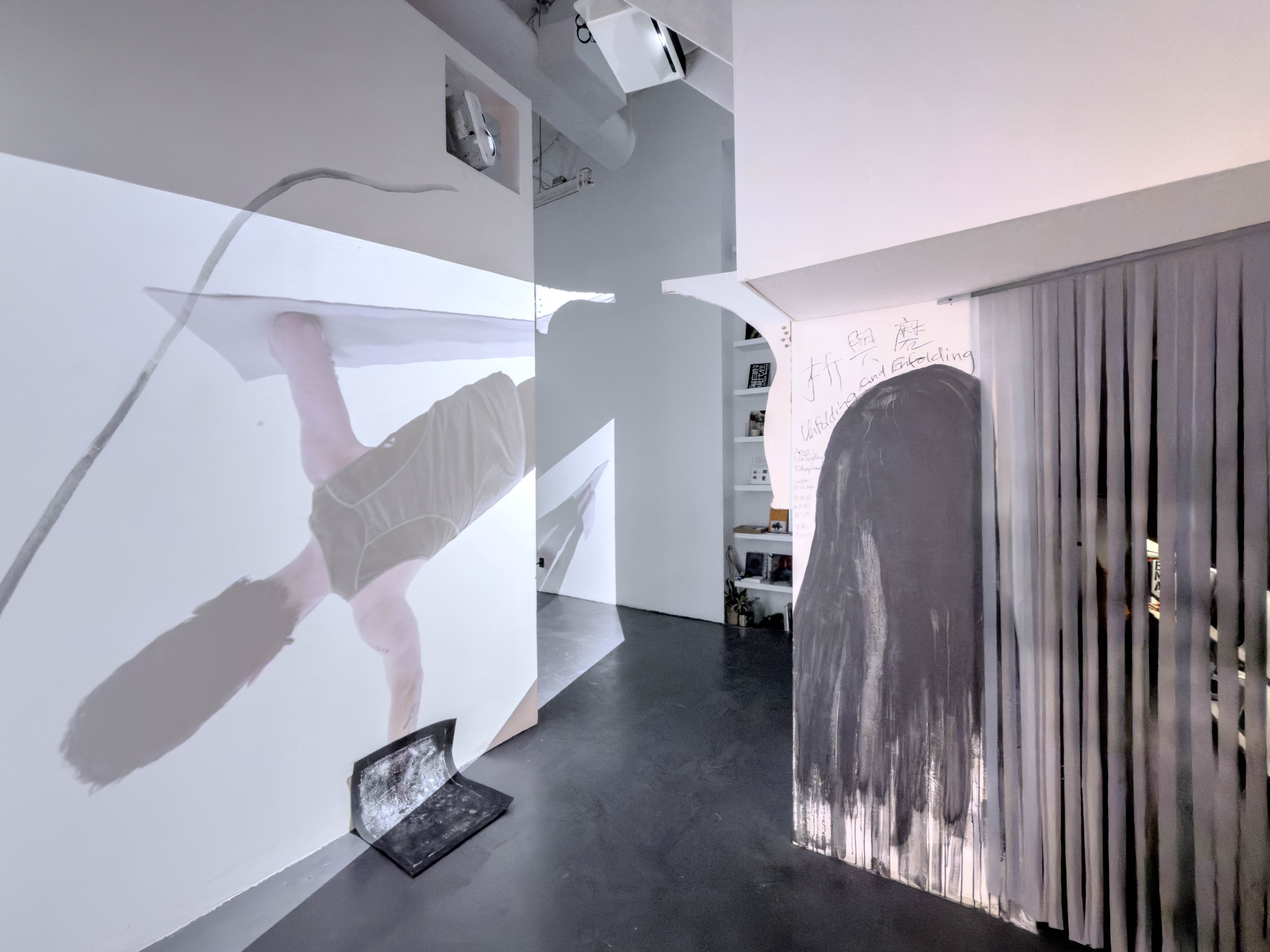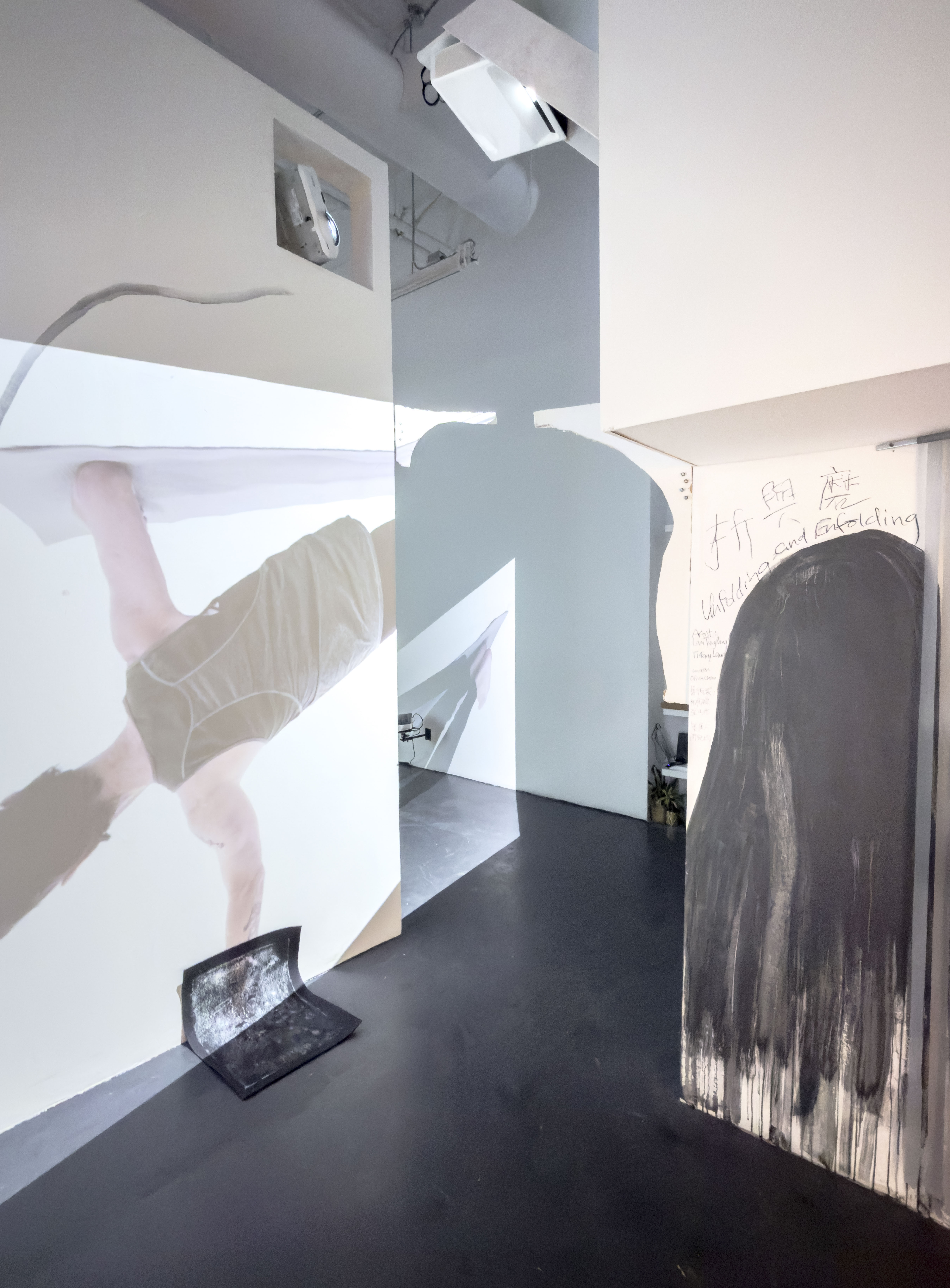 This exhibition explores the performance of the human body and its relationship to landscape. It takes the form of an immersive composition of fragmented bodily forms, presented through recordings of breathing and stretching exercises and gestural illustrations of caves and mountains, folding the body and landscape together. The repetitive labour, flexibility, and endurance involved in both bodily poses and material processes allude to practices of release and self-regulation, as an embodied metaphor for social and institutional participation in everyday life.