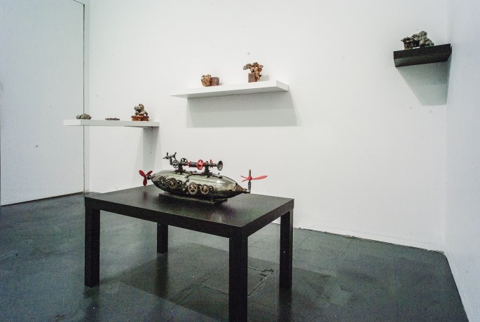 The Immortal of Play exhibition, featuring Amy Chang and Wei Cheng, at gallery Canton-Sardine – in the heart of China Town, Vancouver, opened Sept. 27. This is not the first time that Amy (Li- chuan) Chang and Wei Cheng have collaborated on an exhibition. In December 2018, Wei presented a performance at the Chinese Cultural Centre, supported by the music of Selena Yu, and Amy created an installation of her ‘organic’ objects. It was a well-attended, adventurous and explorative exhibition, as is theImmortal of Play exhibit.The Canton-Sardine is a good-sized gallery with a high ceiling, in the basement of the Sun Wah building on the 200 block of E. Keefer. Steven Dragonn, who curated this exhibit, founded the gallery in July 2018. It is a Vancouver based artist-run centre, focussed on contemporary art, open to publishing, performances and residencies, as well as exhibitions.Once again both artists have pushed boundaries. Amy constructs enticing, precise, irreverent assemblages that suggest inert machinery growing out of organic forms. Quoting from Dragonn’s gallery statement – “Amy Chang’s work takes inspiration from Steampunk, a genre of the 1980s/90s North American subculture … three levels of imitation find peculiar connections between the practical and the useless….”. The humour, inherent in the work, is offset by the rigour of Chang’s manufacture and her attention to detail.