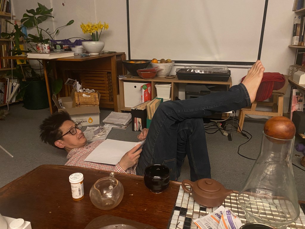 Finally, on a weekend night in mid-May, I stayed at his place and hammered out the project details. Initially, I thought many people would be curious, but it was only at the closing party that someone finally asked me about the meaning behind the photos on the poster. It was that night when he lay on the floor contemplating the statement, and I recorded this casual moment with my phone (actually, there’s another photo taken with Alina’s Mamiya 7 medium format film camera with flash, I’m not sure if it has been developed yet). We discussed many, including the history of the sauna, sauna cultures from around the world, various metaphors and symbolism associated with saunas, sauna scenes in movies, and so on. We primarily wanted to incorporate certain theories but ultimately abandoned them, opting for the simplest expression in drafting the Open Call Statement. He handled the initial description, emphasizing the core idea of returning to human-to-human interaction in a specific space and reflecting on issues of who controls discourse, and so on. We didn’t limit applicants to artists and used the term “proposals” instead. I added the “game” rules, starting with the immediate Open Call instead of conventional exhibition rules, having no opening ceremony, only a closing party instead. The most confusing part is that the closing party also marks the end of the Open Call, ensuring that the entire project remains filled with uncertainty and indeterminacy from start to finish. In the gallery space, the sauna will definitely be present, but what works will appear, how they relate to each other, whether they will turn out as expected, all of that remains unknown. I also prepared for the worst case: perhaps nobody would respond, nobody would submit proposals, and in the end, it would just be the sauna and blank walls. As Jo-Anne said while encouraging my advanture, “No Gain, No Game!”