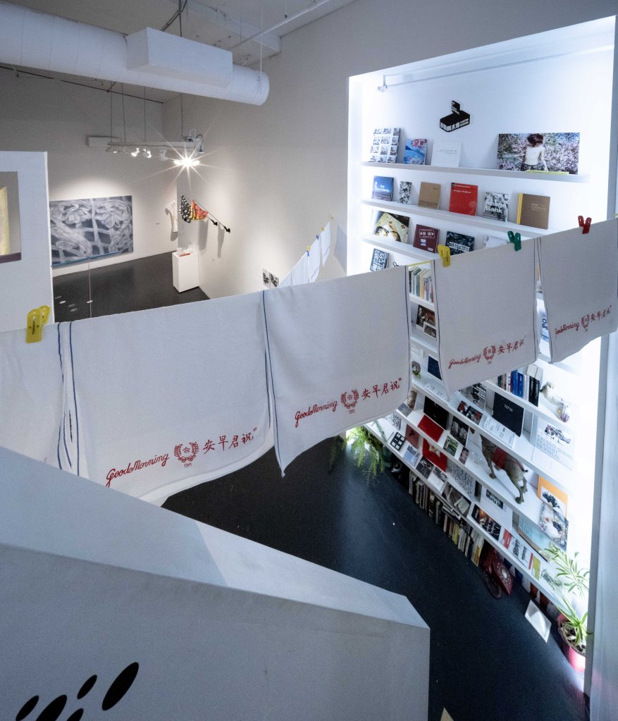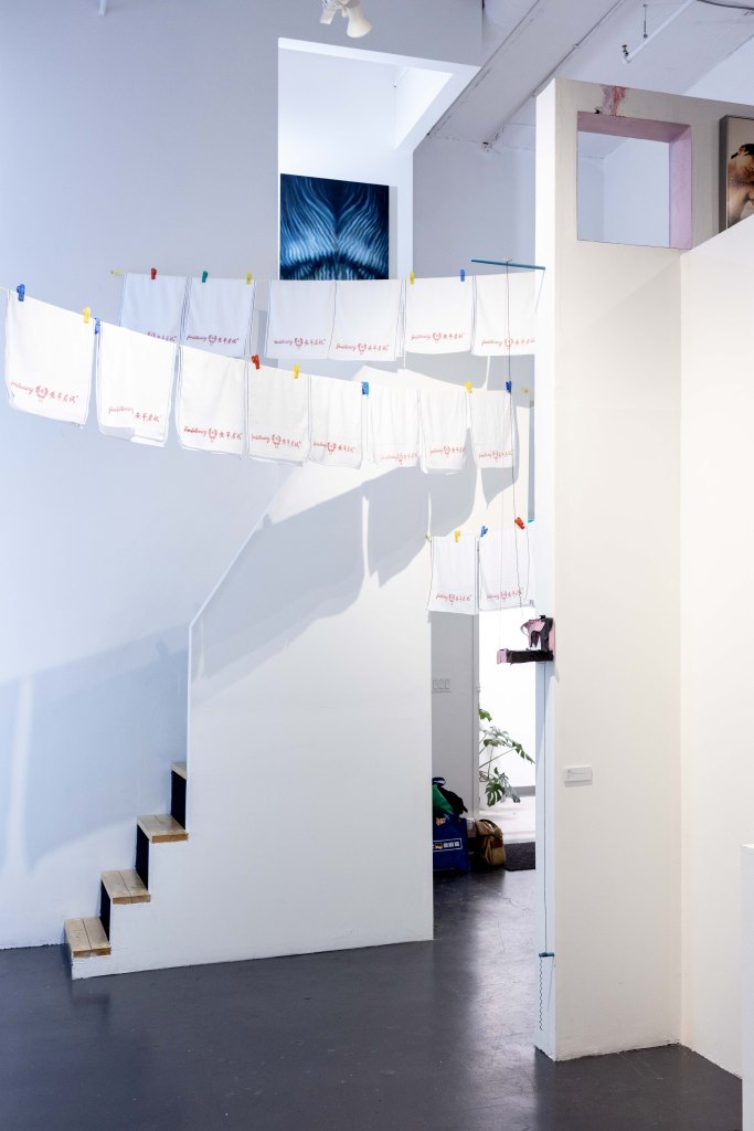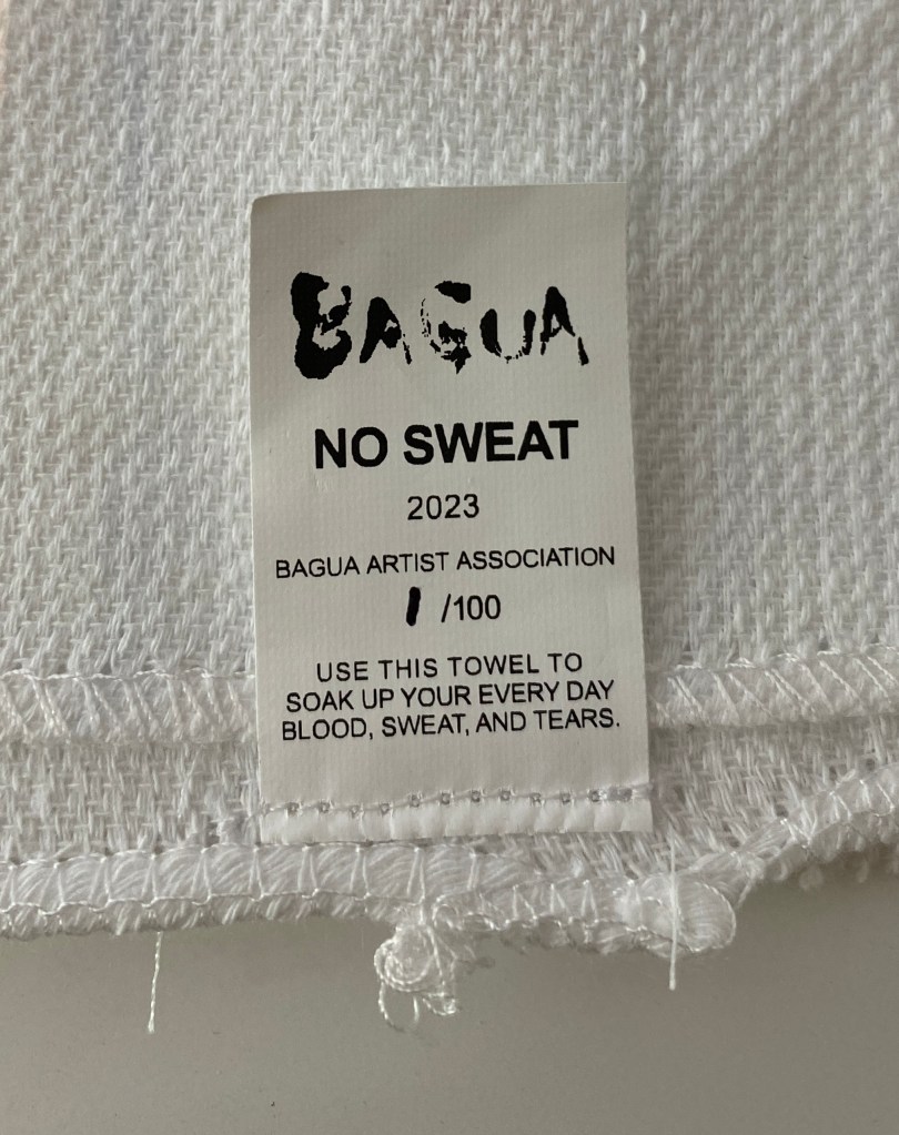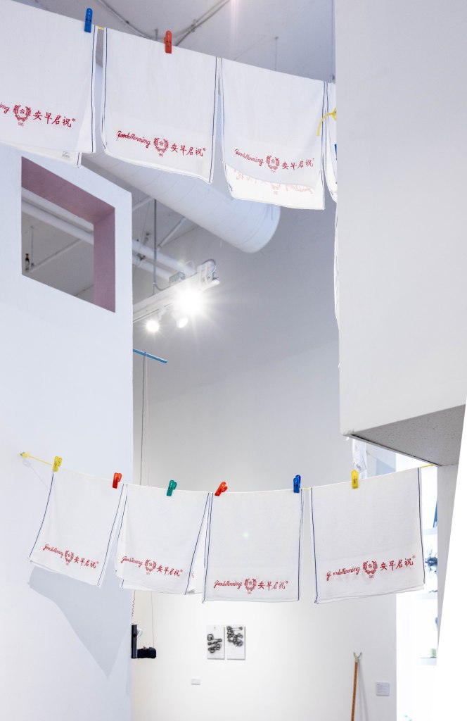 No Sweat, Bagua Artist Association, Good morning towels, wash label, rope, plastic clips, clothing fork, Towel editions of 100, This work is created as part of Chinatown Recreation Mall project, 2023