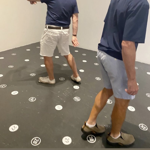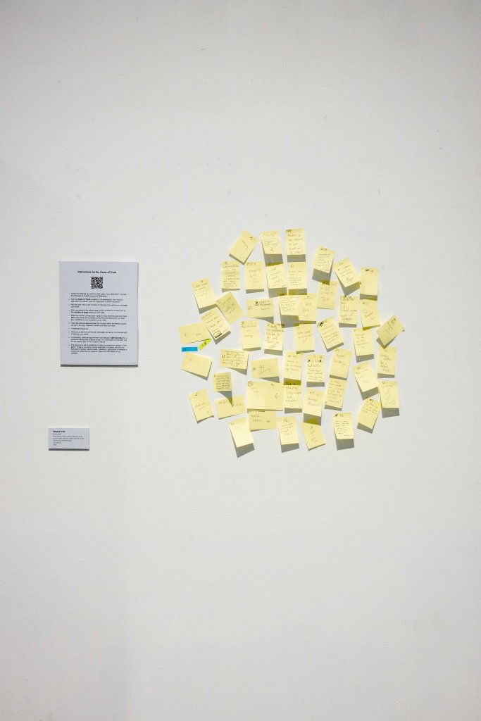 Game of Truth , Kristin Man, Vinyl decal on floor, paper draw lots, dices, post-it paper, ball pen, paper box and virtual interaction via Artivive App, Site specific, 2023