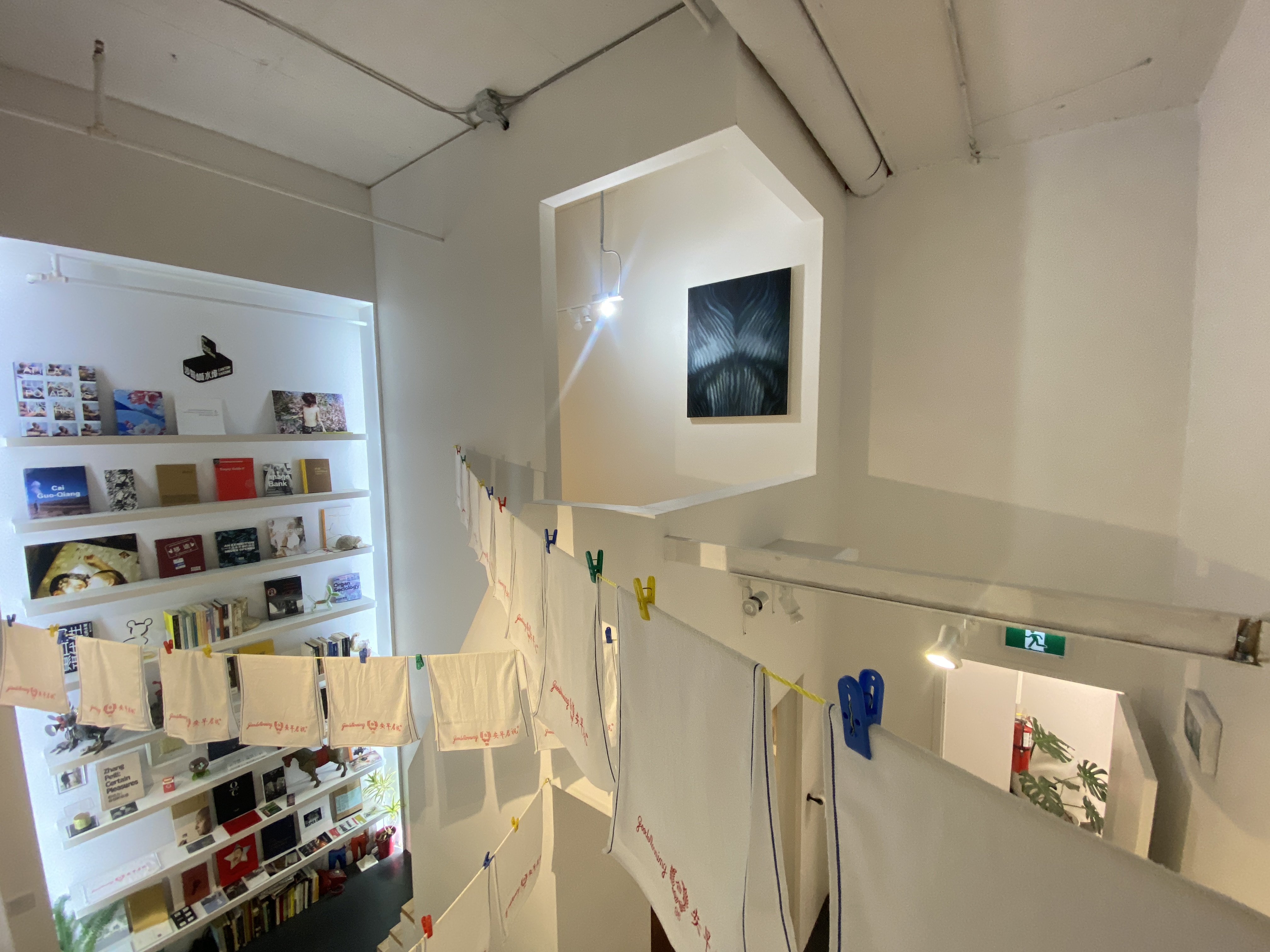 For example, No Sweat by Bagua Artists Association is an interactive installation placed in the entry space. They displayed “Good Morning” towels in the manner of everyday life, where towels are hung out to dry, particularly common during the 80s and 90s in Chinese communities, whether in mainland China, Hong Kong, Taiwan, Malaysia, Singapore, or Chinese communities worldwide, though they have almost disappeared today. Seeing these towels evoked collective memories for many Chinese audiences. Viewers could also take a towel from the hanging ropes, especially when they wanted to enjoy the sauna and didn’t bring their own towels. Besides, the use of towels as the main subject is also applied to Alejandra Camacho’s piece All You See is Me, where a video shows a slightly switching forest landscape on Google Earth through a hole burned in a towel while viewing it in the sauna room. The Bagua Artists Association’s way of “towels are used to wipe sweat” also corresponds exactly to Paul Wong’s Two Uniforms – After work sauna for waitress and cook. Both are found objects from Chinatown, both are about sweat, and both are works of textiles. Additionally, Stephanie Gagne’s ready-made textile work Disappointments from my past is about flags made from two ex-boyfriends’ underwear and hung on the exhibition wall, serving as a declaration or release of private life in a humorous way. This pair of flags coincidentally correspond to Paul Wong’s pair of uniforms. Similarly, Charlotte Yao’s Two Meters Apart, which is a poem she recreated by using charcoal on two pages from a letter written by former UK Prime Minister Boris Johnson to the UK public during the Pandemic. It’s also a form of dialogue on discourse power through a declaration. Interestingly, the form of poem is also a component of Hannah Möller’s work Kachelofen: Hand Made Warmth / Slug Skin Tiles. Furthermore, as mentioned earlier, the small window on Hannah Möller’s “fireplace” connects to Paige Quinn’s The prayer, not the prayer. Paige’s another oil painting, The wedding, featuring a female figure in a shower, juxtaposed with Polit-Sheer-Form-Office’s photography, creates a confrontation between gender, and between the individuality and the collective.
