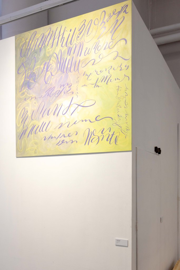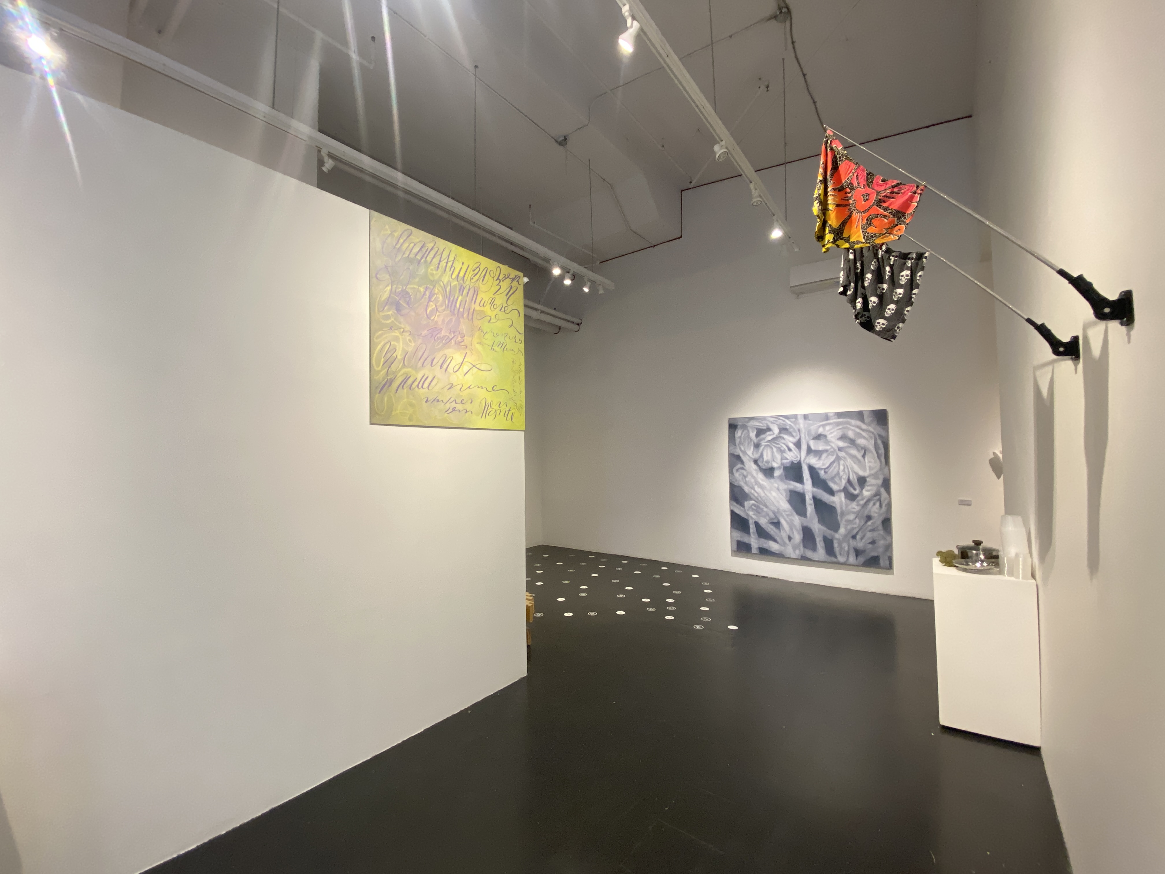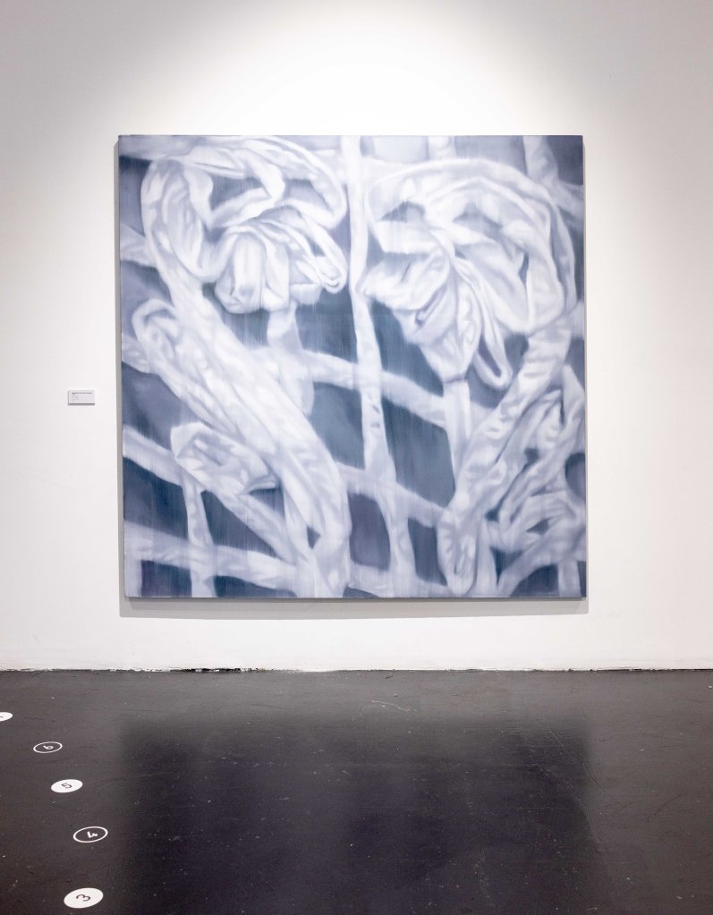 On the other hand, the knot on Paul Wong’s uniform does indeed bear a striking resemblance to the imagery in Gillian Haigh’s large size painting No Reason To Say That There Was a Time. Gillian’s work expresses a perception of ambiguity in objects, both visually and in terms of perception or language. Her other piece, Lipslip, explores the humor arising from linguistic errors, which aligns with Jonathan Alfaro’s work. Jonathan’s work appears to resemble a form of calligraphy but doesn’t belong to any existing language. This state of linguistic ambiguity readily resonates with immigrant communities, marginalized groups, and LGBTQ+ communities. It’s worth noting that Jonathan’s Poesyposieposyposey was created by directly drawing on the gallery wall with pure silver sheets, a temporary graffiti technique that lends an added layer of fragility to the artwork. Co-presented with Gillian and Jonathan, Natalie Schmitt also contributed a piece, Unfold, which was also produced on-site based on the spatial environment. She cleverly leveraged the spatial relationship among her work, Gillian’s and Jonathan’s pieces to create a suspended sense of uncertainty. This “suspension” also aligns with the hanging form employed along with the Bagua Artist Association’s piece side by side.
