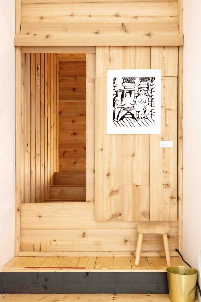 I place significant importance on the visual context and experience that a work creates when it enters a specific spatial environment. When we received proposals for these two works, I didn’t initially find out where they should be placed. It was only at the end of June, after we had set up the sauna room, that I thought the best place to position Wang Yi’s artwork was to attach it with thumbtacks on the sliding door panel of the sauna room. I must emphasize that before constructing the sauna room, I had drawn a rough sketch to calculate the necessary materials, but in reality, during the construction process, we made modifications based on the materials we obtained. For example, the sliding door wasn’t in the plan. So, hanging Wang Yi’s print on the door was unexpected, more or less like it was destined to be there—forming a relationship of mutual enhancement between a representation of steam room through an print and a physical one. It raises questions: is the print a tangible decoration, or is the tangible sauna a simulated container for the print? Many Business premises hang relative pictures to attract customers or create a sense of professionalism. It’s an aspect of daily life., we attempt to question the relationship between space and its occupants by displacing this stereotype.