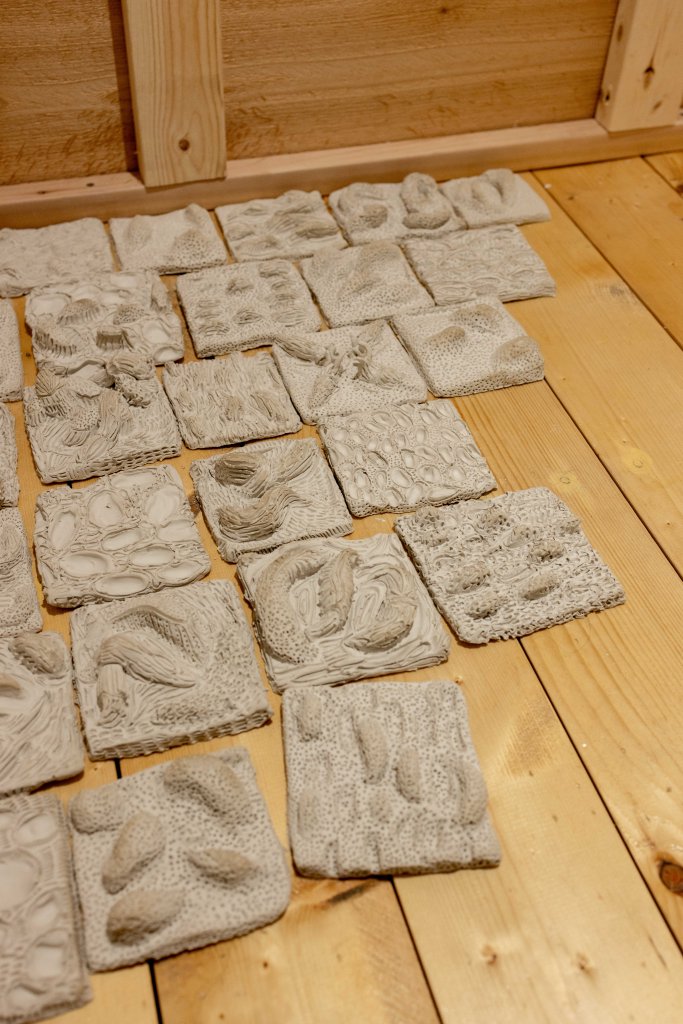 Kachelofen: Hand Made Warmth / Slug Skin Tiles, Hannah Möller, Clay, acrylic, paper, ink, Dimensions vary, 2023